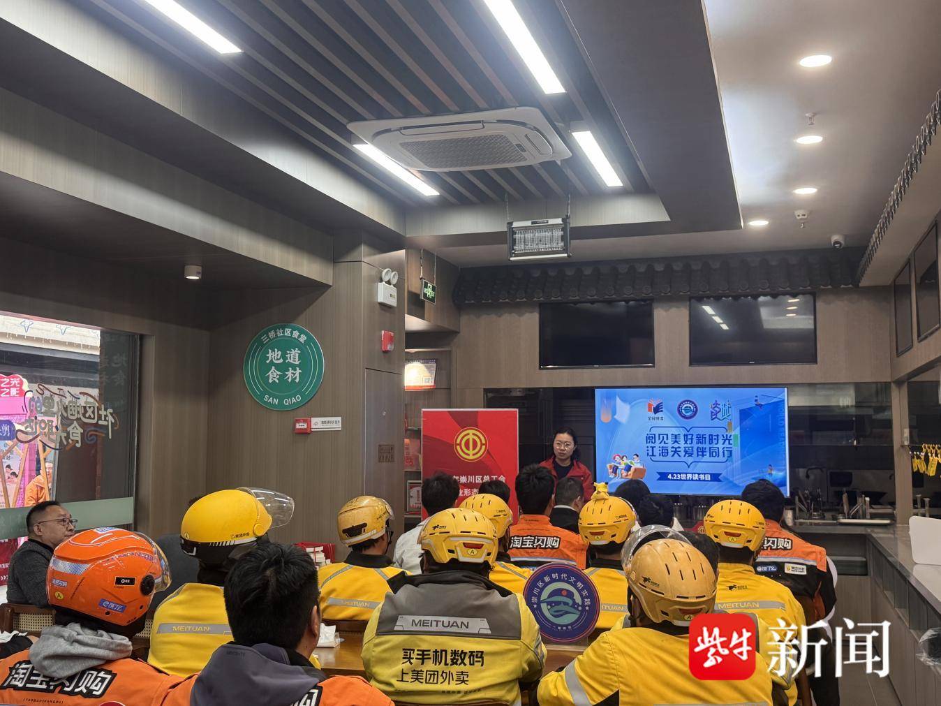 四月春光好,书香沁人心。在第31个“世界读书日”来临之际,为丰富辖区新业态群体的精神文化生活,扎实推进“读城”行动走深走实,南通崇川经济开发区三桥社区新时代文明实践站在社区食堂开展了“书香致远润初心 阅启新程暖‘新’人”主题阅读活动。来自辖区的网约车司机、外卖员、保安等新业态劳动者代表围坐一堂,在阅读的滋养与社区的关怀中,提前度过了一个别样的读书日。