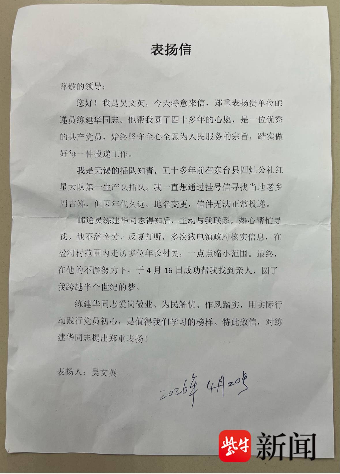 “他帮我圆了四十多年的心愿,是一位优秀的共产党员,始终坚守全心全意为人民服务的宗旨。”4月21日,一封发自苏州的表扬信寄达盐城东台邮政分公司,字里行间满是一位老人跨越半个世纪的激动与谢意,信中反复点赞的,正是东台范公揽投部高新区揽投站投递员练建华。