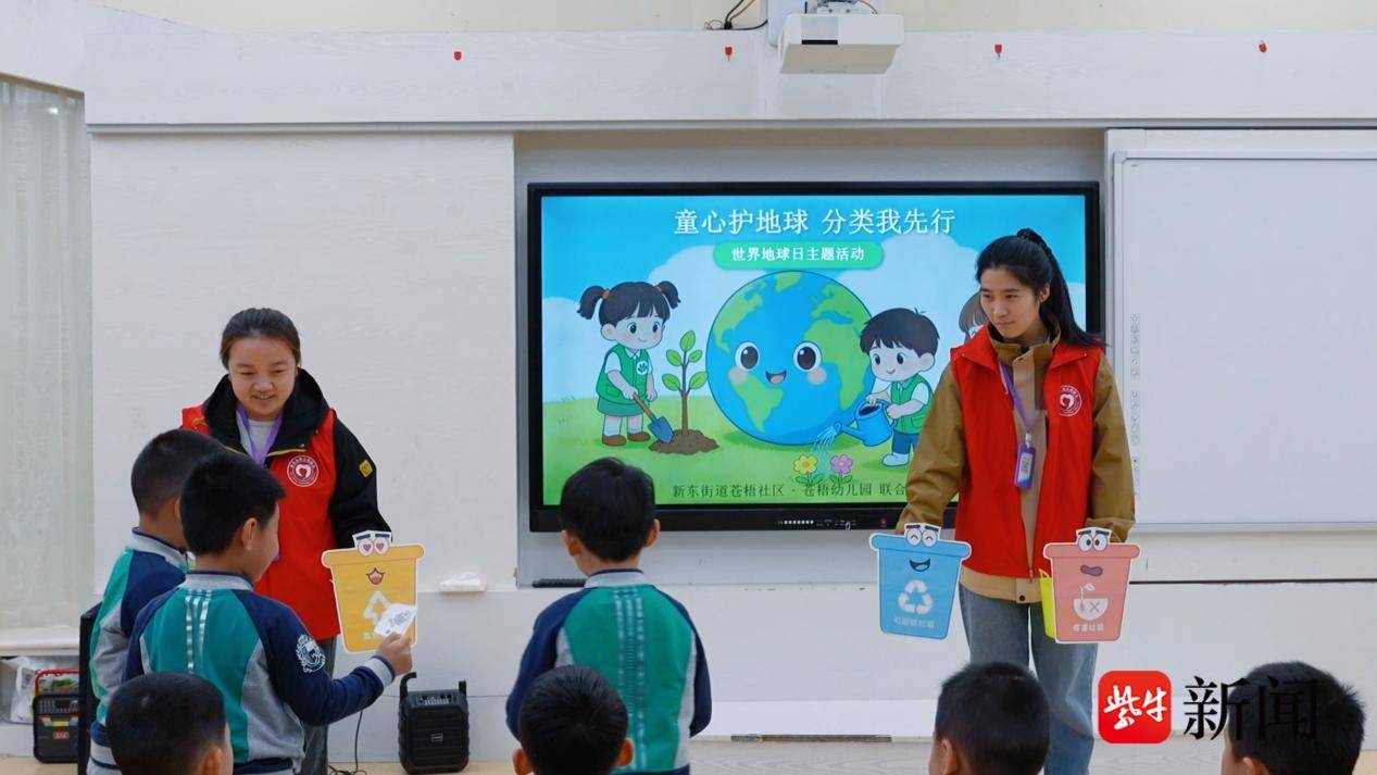 世界地球日前夕,连云港市海州区新东街道苍梧社区工作人员走进苍梧幼儿园,开展“童心护地球 分类我先行”主题宣传活动,通过多种互动形式,让孩子们在轻松愉悦的氛围中学习环保知识,在心中种下爱护地球的绿色种子。