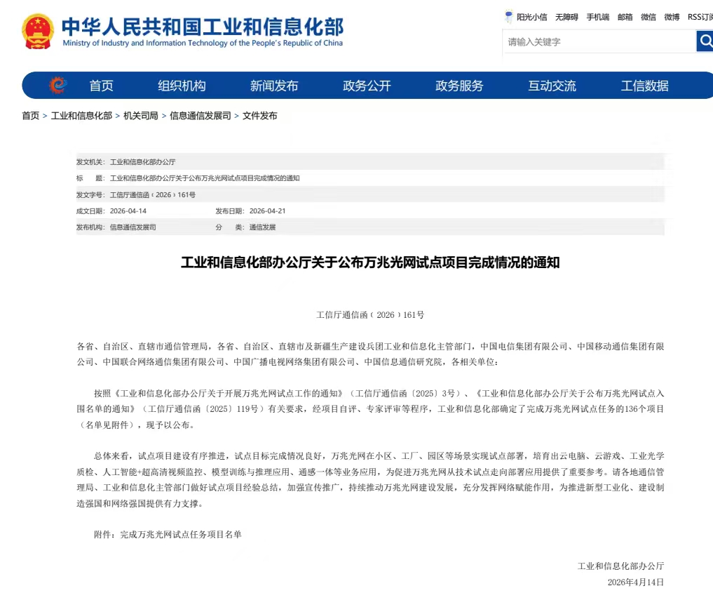 国家工信部网站公示验收结果