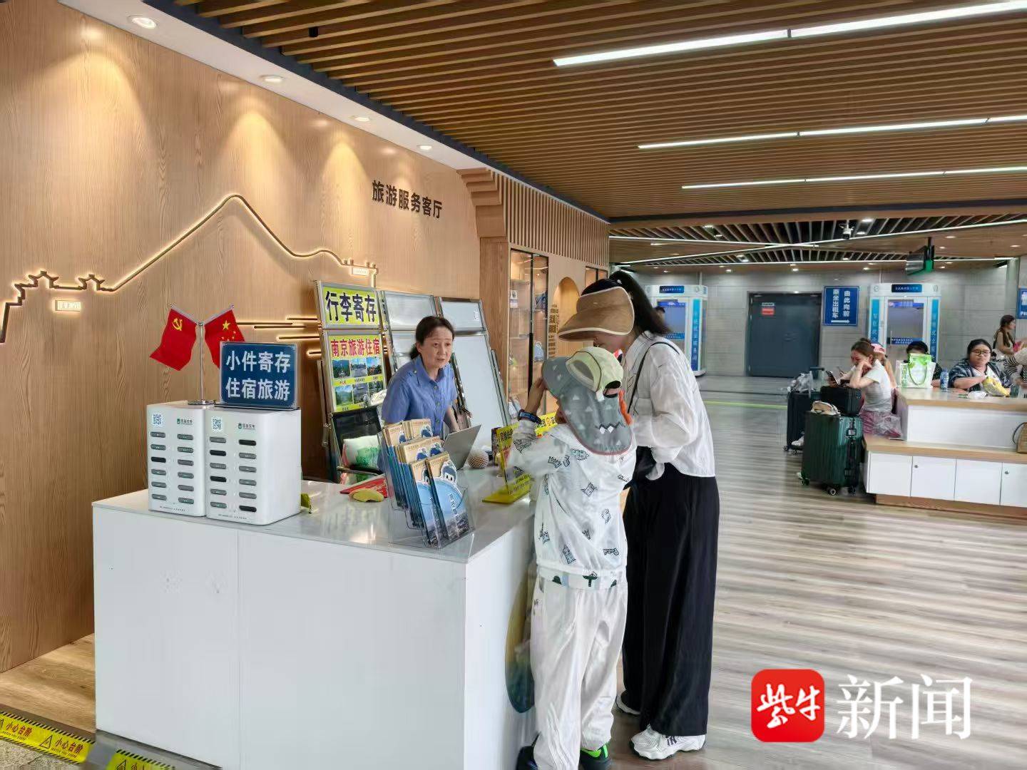 位于南京站北广场出站口的旅游服务客厅也改造一新,面向来宁旅客和游客开放,在这里可以小憩一刻、寄存行李,工作人员还提供旅游推介和公益服务。
