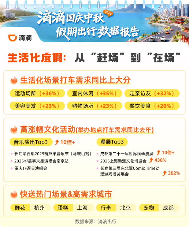 今年国庆中秋假期,滴滴出行数据显示,日均打车需求同比去年上涨14%,全时段较去年呈上涨态势。假期异地打车需求相比节前上涨89%,长线游、跨境游需求激增的同时,“向外探索”与“向内悠闲”交织,生活化、慢度假正在重构假期“附近”消费动线。预约用车的出行需求比节前上涨58%,涨幅排名前5城市分别是桂林、南昌、大理、徐州、揭阳,涨幅均超过100%。