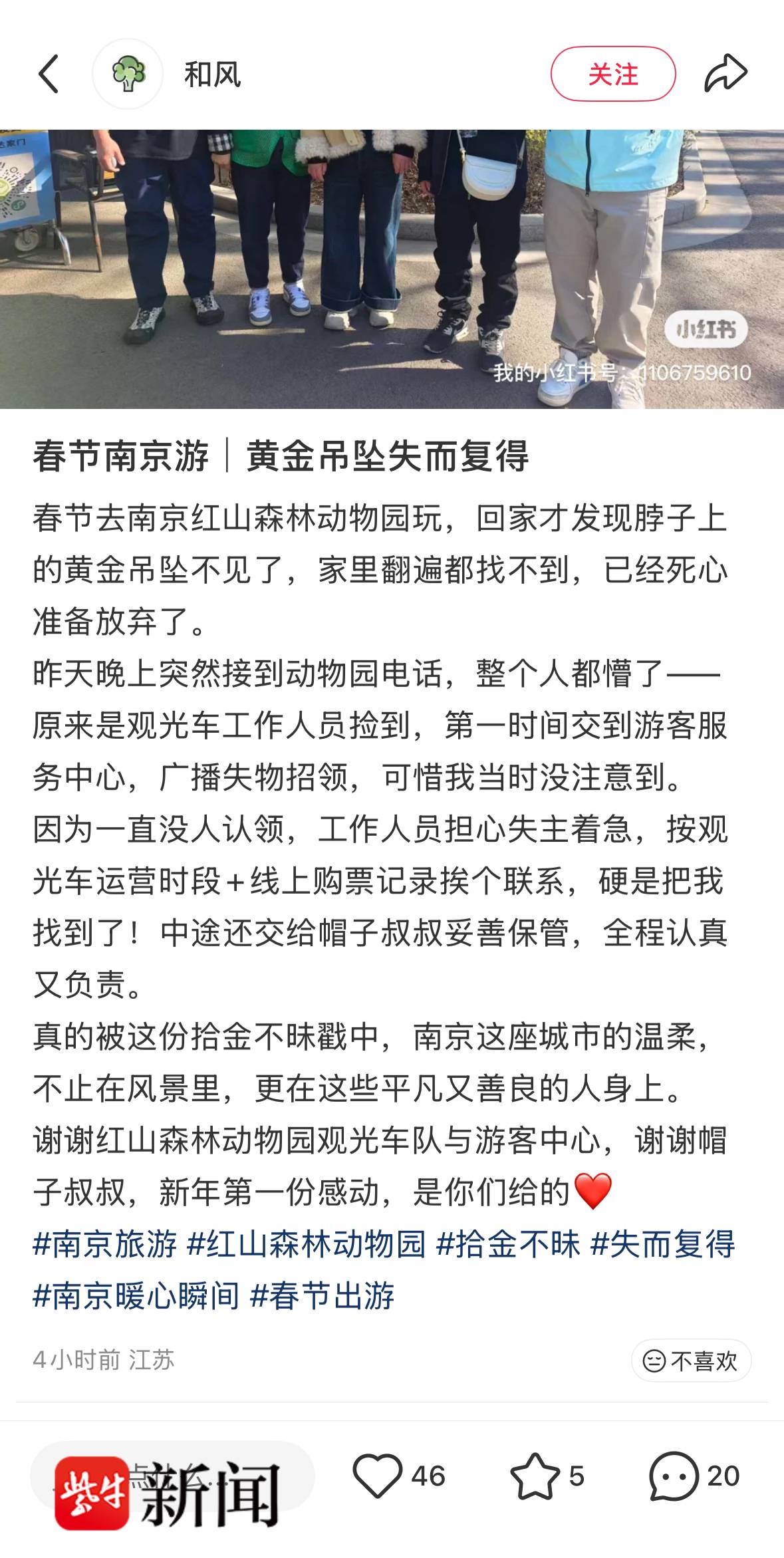 “南京这座城市的温柔,不止在风景里,更在这些平凡又善良的人身上!”2月21日,农历大年初五,一位网友在社交媒体上发帖讲述了春节期间在南京的暖心旅程,瞬间引起了网友的关注和讨论。记者了解到,这是一个发生在南京红山动物园的拾“金”不昧温暖故事。