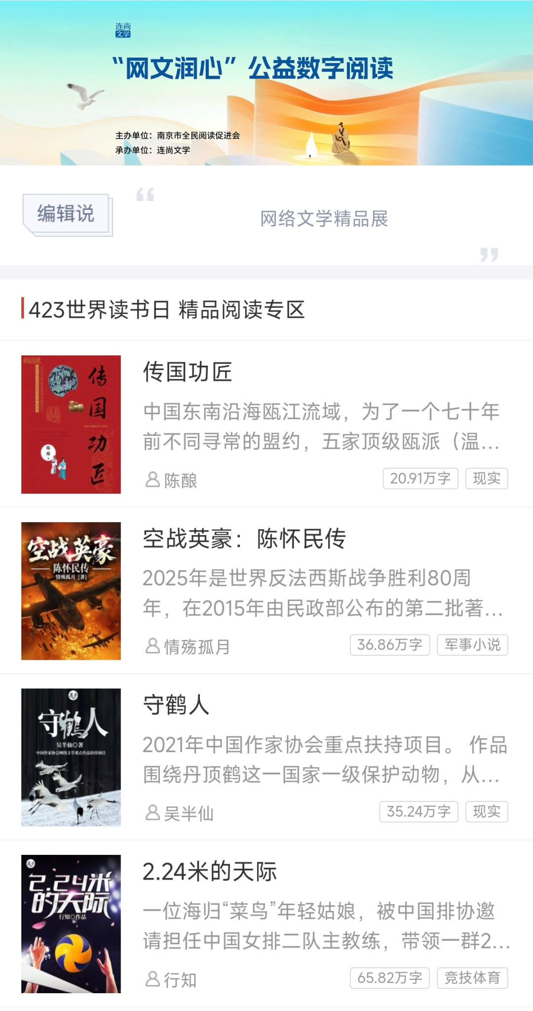 南京市全民阅读促进会携手连尚文学、红薯网、酷匠网、喵阅读、落尘文学等本地优质数字阅读平台,特别推出 “网文润心”公益数字阅读活动 —— 上百本优质网络文学作品,全部免费开放,等你来读!