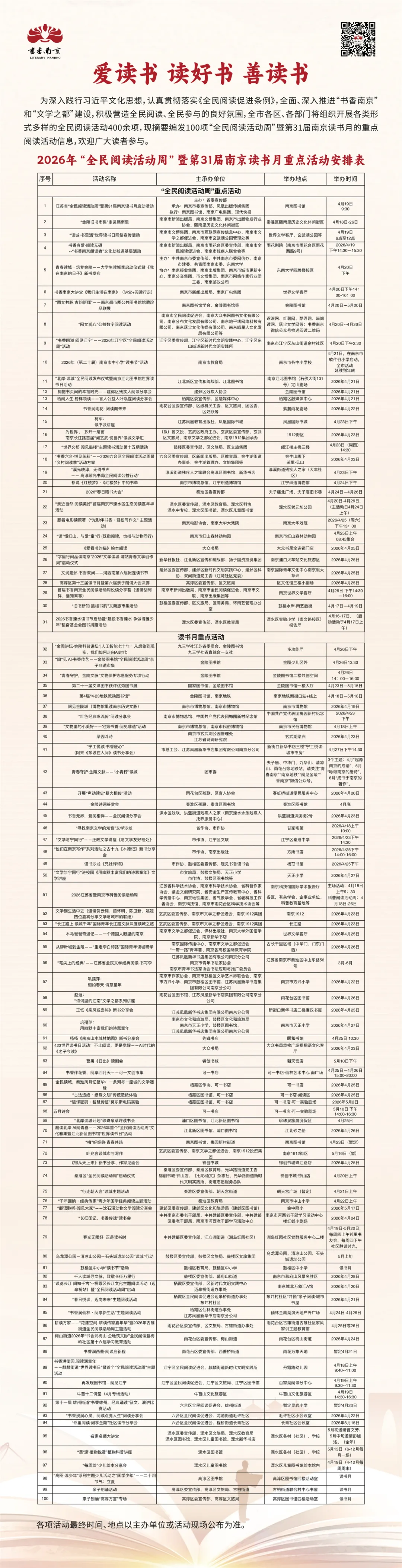 第31届南京读书月(4月20日—5月20日)期间,南京共将组织开展主题阅读、传统经典阅读、重点群体阅读、科普阅读和数字阅读等各类阅读活动400余场,通过开展“书香南京大讲堂”、“悦读分享荟”等系列活动,邀请天瑞说符、柯军、胡阿祥、潘知常、周忠和、苗怀明、祁智、阿莱等文学、科学、艺术领域的代表性名家,以讲座、对谈等形式分享智慧与感悟,品读书香,努力满足人民群众高质量阅读需求,积极营造“爱读书、读好书、善读书”的良好氛围。