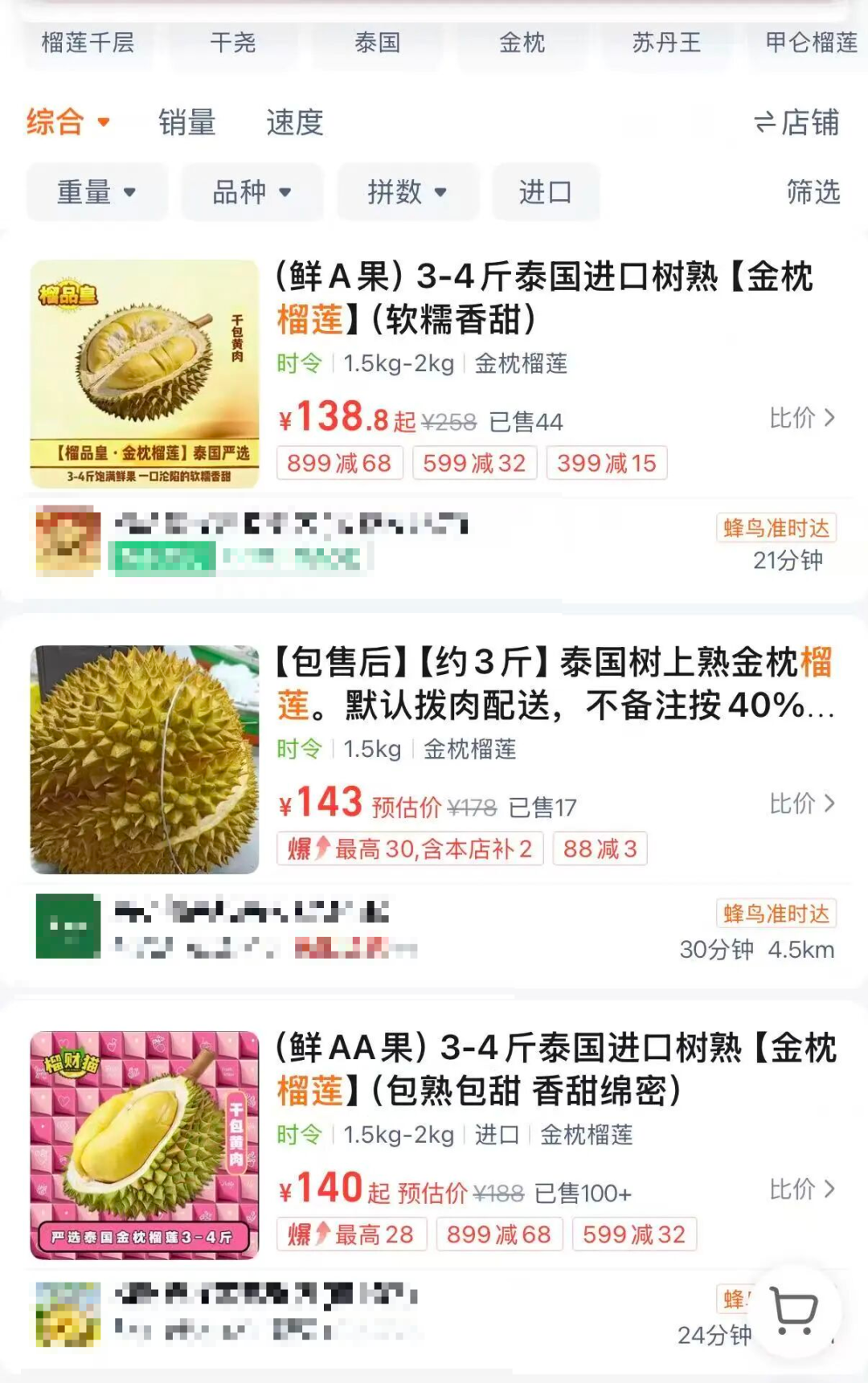 在南京,多家电商平台上的金枕榴莲价格,在30元—35元/斤。