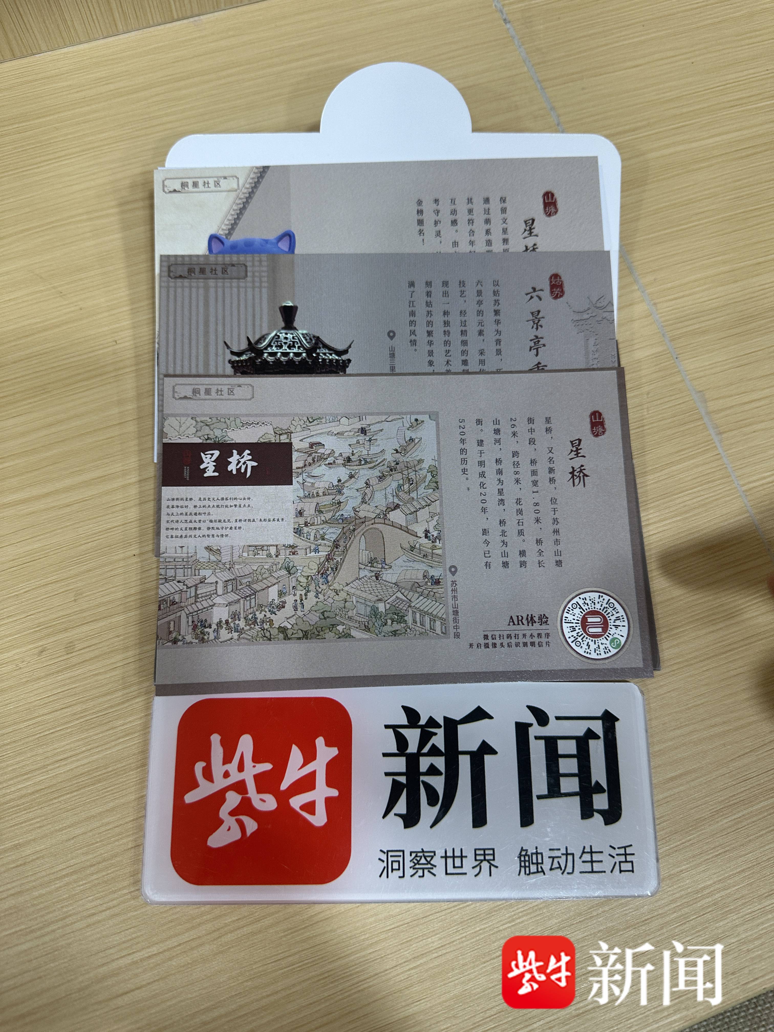 走近驿站内的展示区,三张设计精致的AR导览明信片在灯光下格外惹眼,画面分别聚焦山塘街标志性的星桥、充满烟火气的星桥坊以及兼具工艺美感的六景亭熏炉,每一张都像是浓缩了古街一角的文化切片。“只要用手机扫描卡片上的二维码,不仅能看到介绍视频,还有数字向导来讲解。”驿站工作人员蒋女士拿起一张“星桥”主题明信片,现场为记者演示操作。