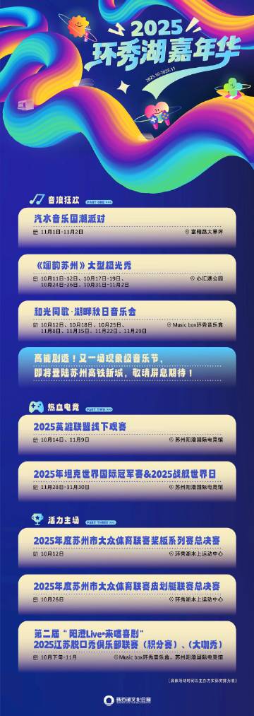 10月中旬-11月,2025环秀湖嘉年华来了。音乐节、极光秀、电竞赛事、脱口秀...将为大家带来不一样的精彩。