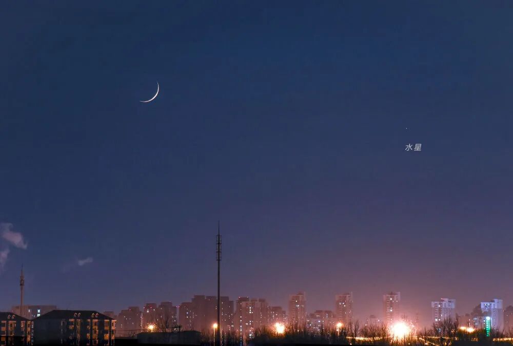 2022年1月7日水星东大距,这是同年1月4日在天津东丽区拍摄的水星和月亮。(杨婧 摄)