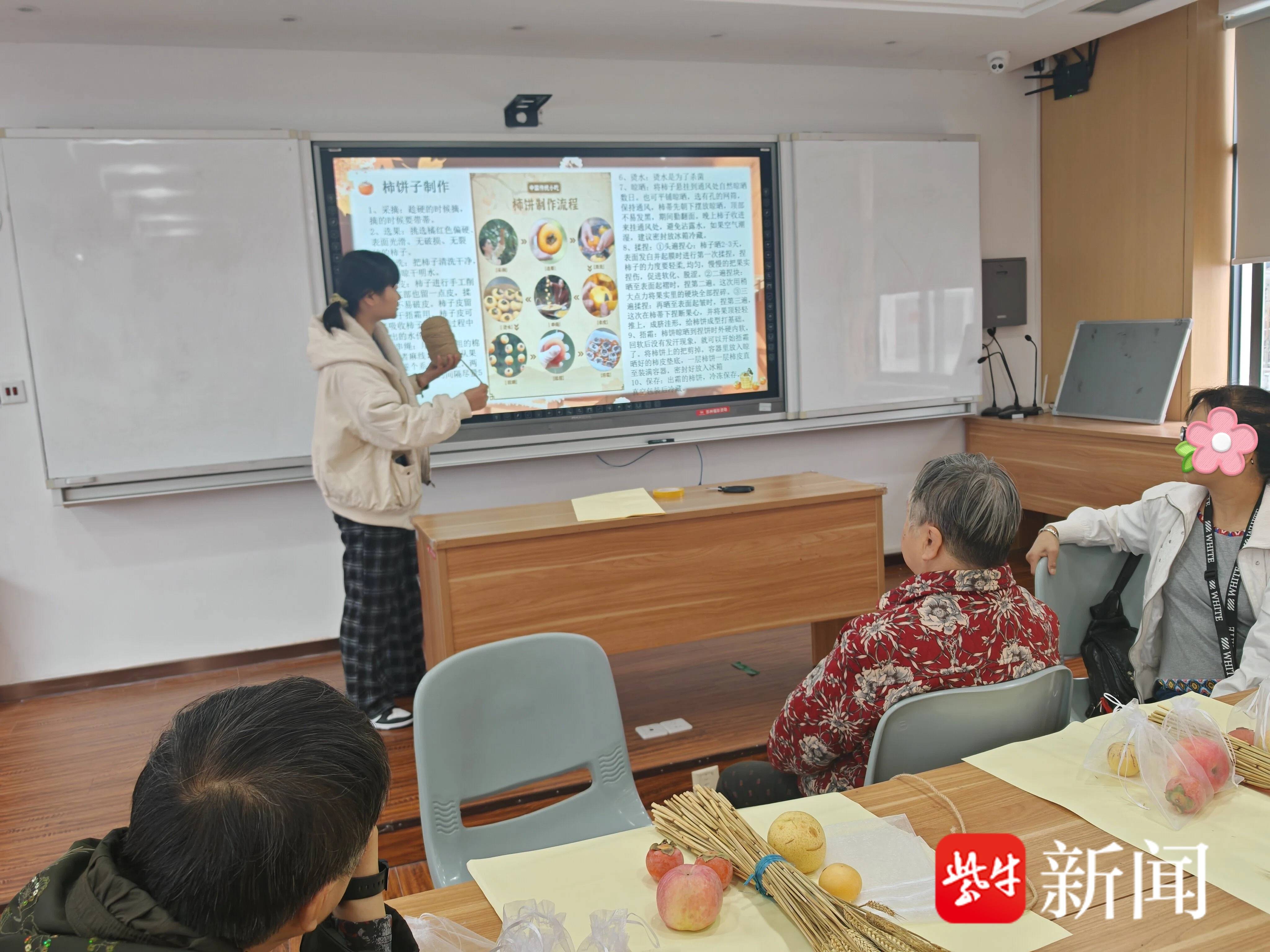 结合霜降“吃柿子”的习俗,活动还特别设置了柿饼制作教学环节。从选果、清洗、去皮,到晾晒环境、揉捏时机、捂霜保存等步骤,顾站长一一倾囊相授,并贴心提示:“柿子要选果肉饱满、表皮完好的,晾晒时注意通风避雨,定期轻揉使其质地均匀,这样才能做出霜白味甜、软糯可口的好柿饼。”现场居民们听得十分专注,纷纷表示:“今天不仅做了挂饰,还学会了做柿饼,回去就要试试,让家人也尝尝这口‘秋日甜’。”