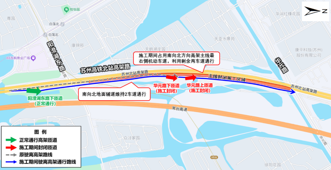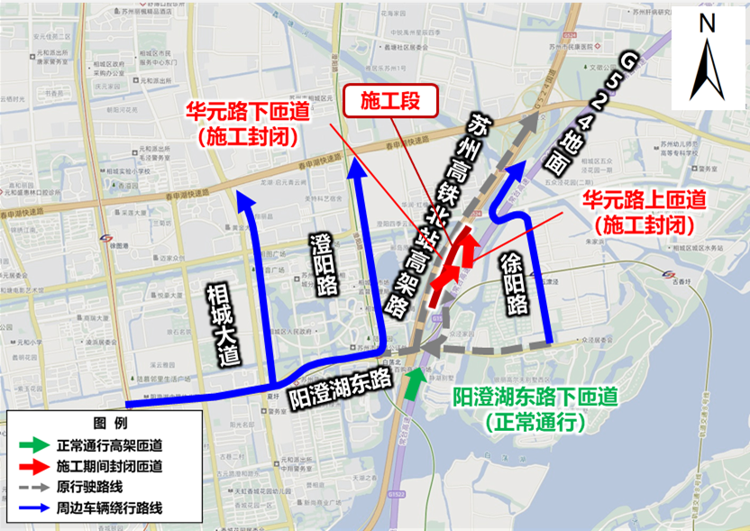 (二)施工期间封闭华元路下匝道与华元路上匝道,离开高架车辆请根据指引提前在南侧阳澄湖东路匝道出口驶离;
