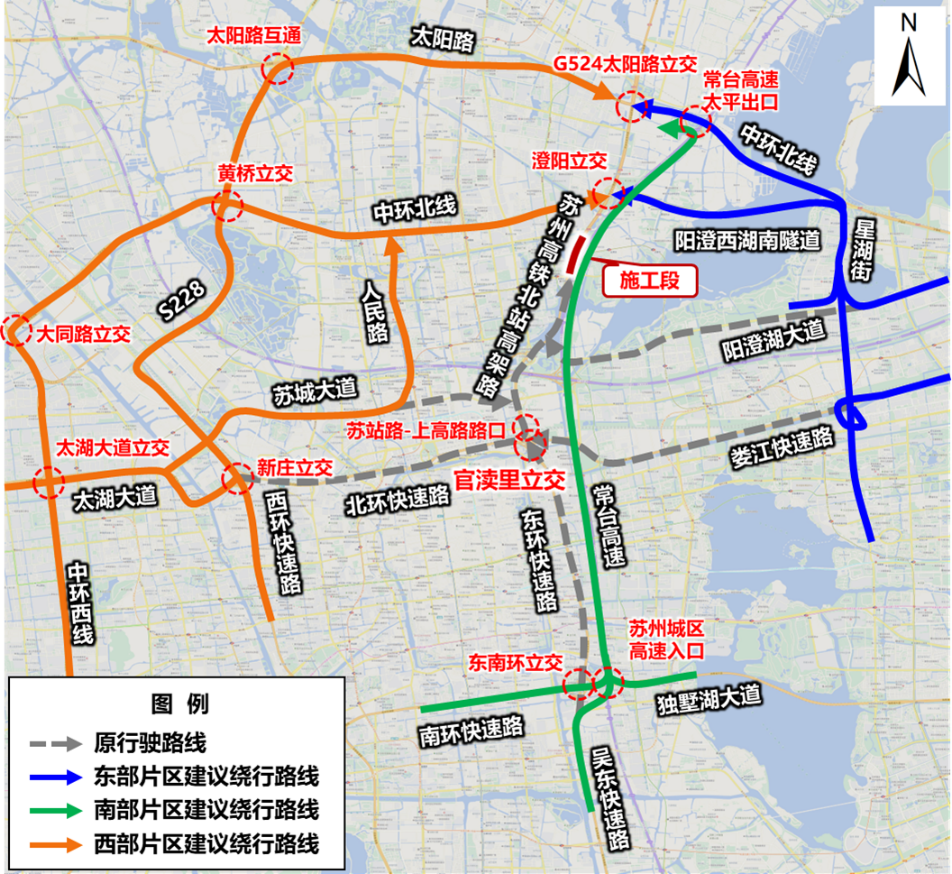 (三)精细诱导分流。施工期间,公安交管部门将在上高路转苏州北站高架路匝道处、苏城大道转上高路匝道处两处管控点位基础上,视情对北环快速路、东环快速路、娄江快速路等快速路节点进行动态管控。同时,在完善交通设施和指引基础上,公安交管部门将会同高德、百度等导航地图平台进行精准诱导分流,全力保障施工期间周边交通流量均衡。