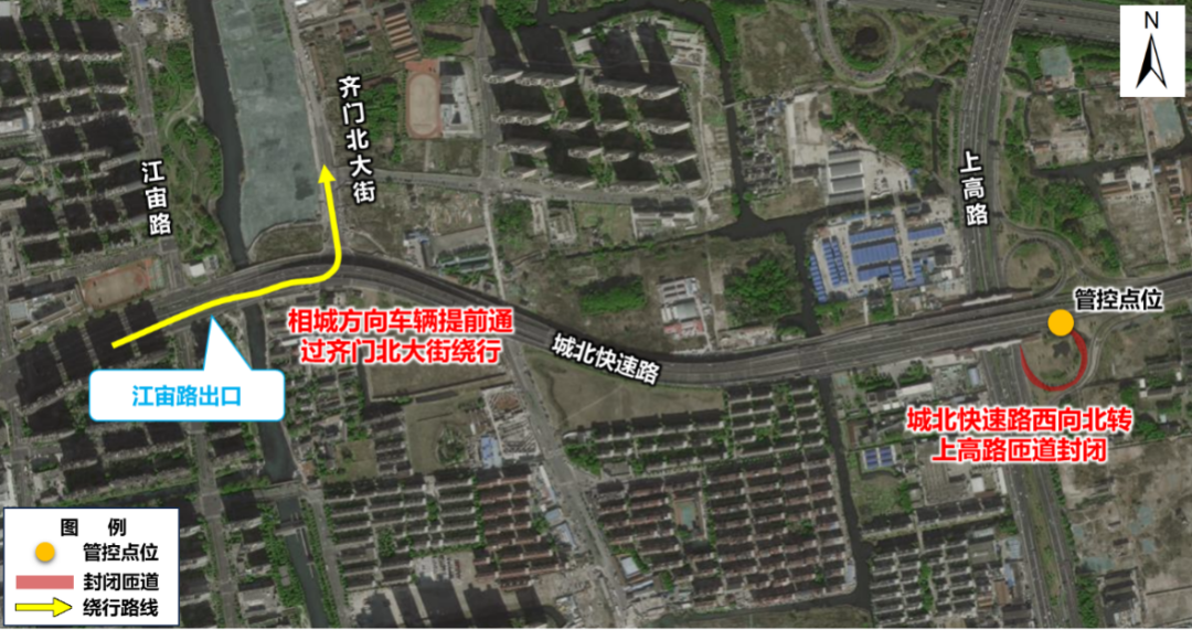 苏城大道西向北转上高路匝道早晚高峰期间根据交通流量视情管控,过往机动车可在江宙路出口提前驶离,从齐门北大街绕行。