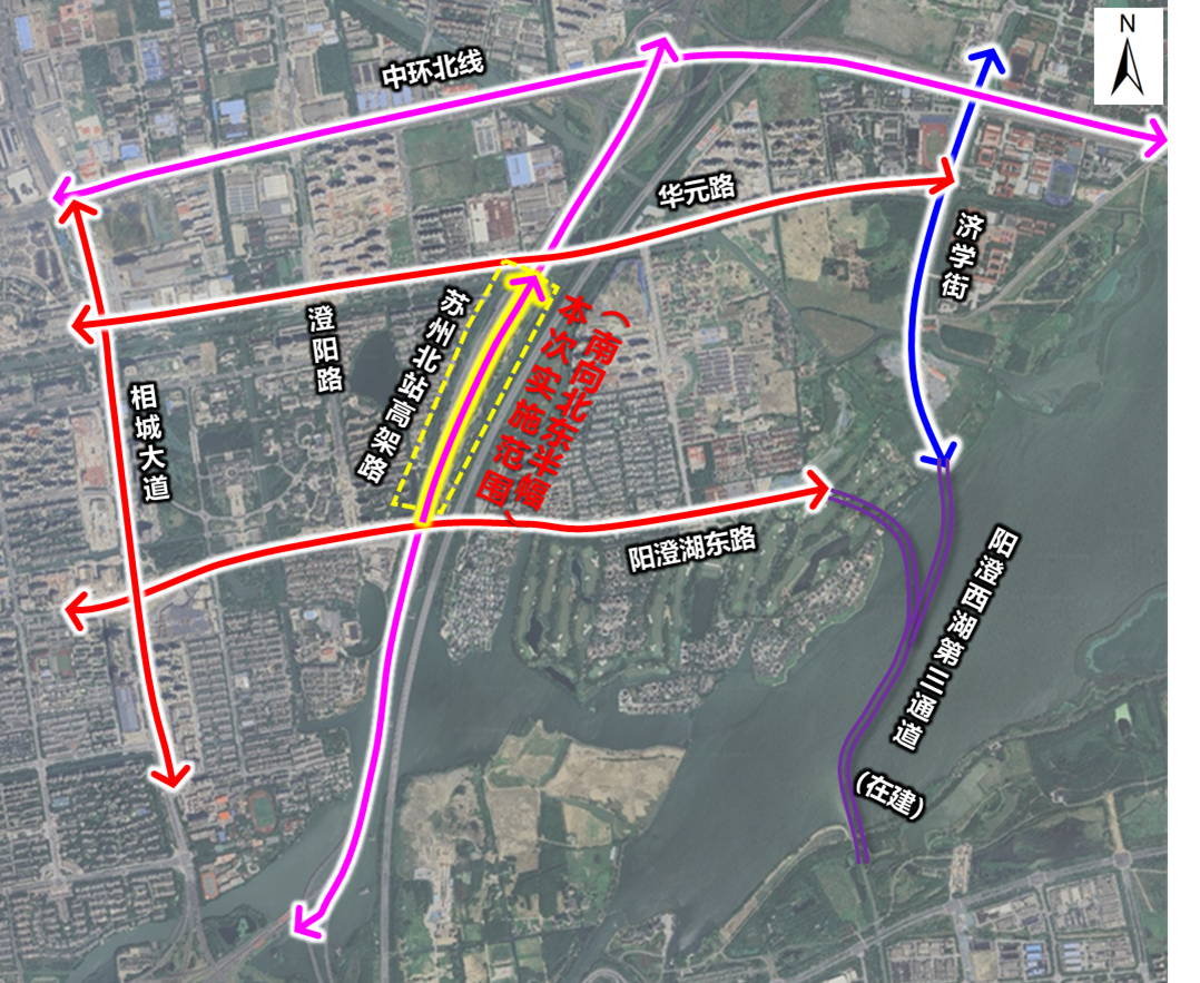阳澄西湖第三通道工程是联系苏州市相城区和工业园区的重要通道。苏州北站高架路拼宽段项目作为阳澄西路第三通道工程的一部分,旨在对苏州北站高架路进行桥面拓宽,缓解交通拥堵。根据施工计划,需占用苏州北站高架路局部机动车道进行作业,于2025年10月29日至2026年1月10日,对苏州北站高架路(阳澄湖东路-华元路)局部机动车道实施封闭施工。