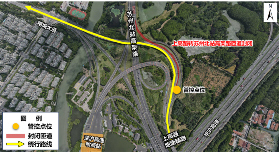 上高路地面转苏州北站高架路早晚高峰期间根据交通流量视情管控,过往机动车可从相城大道绕行。