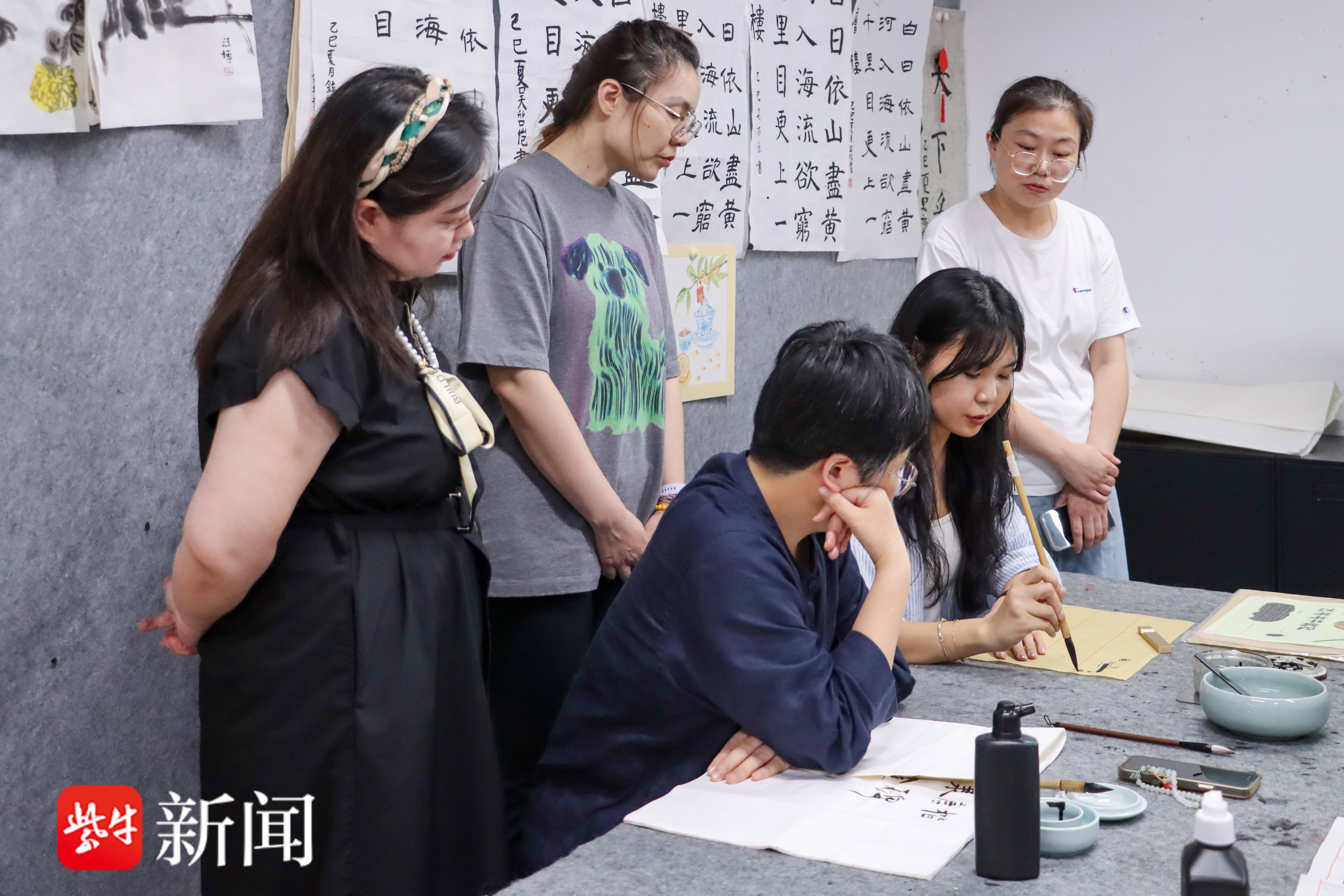 课堂上,老师从篆书、隶书、楷书等常见毛笔字体的特点切入,为学员们清晰梳理了字体的演变脉络,帮助他们建立起对书法艺术的宏观认知。随后,老师示范握笔姿势与运笔手法,从“指实掌虚”的握笔要领到“中锋行笔”的运笔技巧,逐一拆解,手把手教学。在老师的耐心指导下,学员们从最基础的笔画练起。笔尖流转,墨色晕染,原本对书法陌生的他们逐渐找到了书写的感觉,整个课堂充满了专注与探索的氛围。