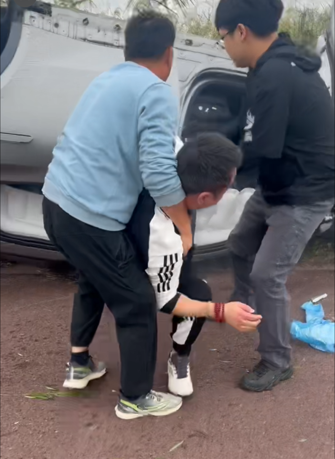 小秦试图拉开车门,但车门严重变形,开门极为困难。那位身着浅蓝上衣的男子立即俯身探向门内,发现司机被安全带倒悬卡在驾驶座上,意识模糊。两人配合默契,解开安全带后,合力将司机从窄小的车上小心翼翼拉出,扶至安全地带。