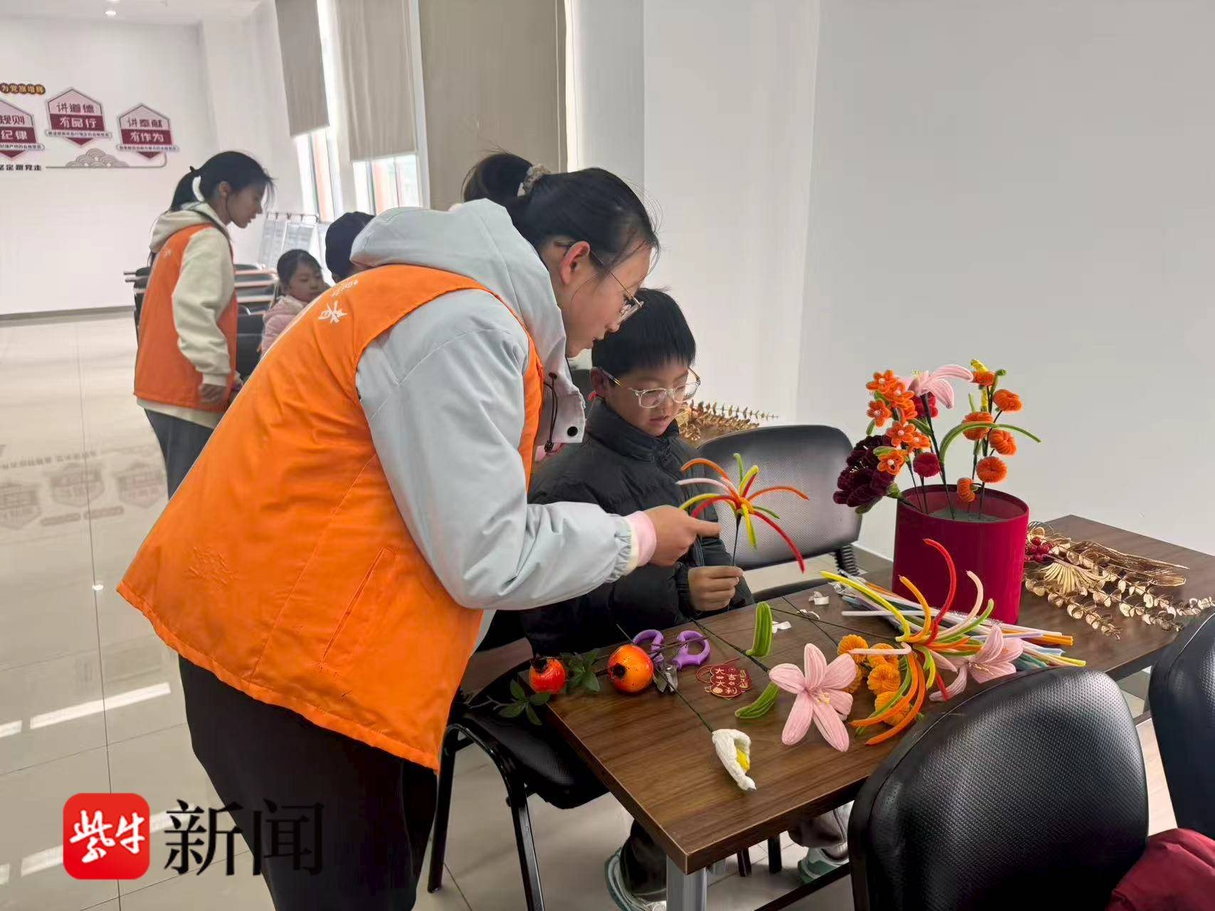 烟花制作完毕,孩子们转入绒花抱抱桶创作环节。志愿者老师提前备好牡丹、柿子、百合等寓意吉祥的绒花制品,孩子们根据自己的喜好,将各类绒花精心搭配、错落摆放,亲手打造专属自己的新春抱抱桶。待所有抱抱桶制作完毕,志愿者们还为孩子们送上了各类糖葫芦,希望孩子们新的一年红红火火、喜乐顺遂。