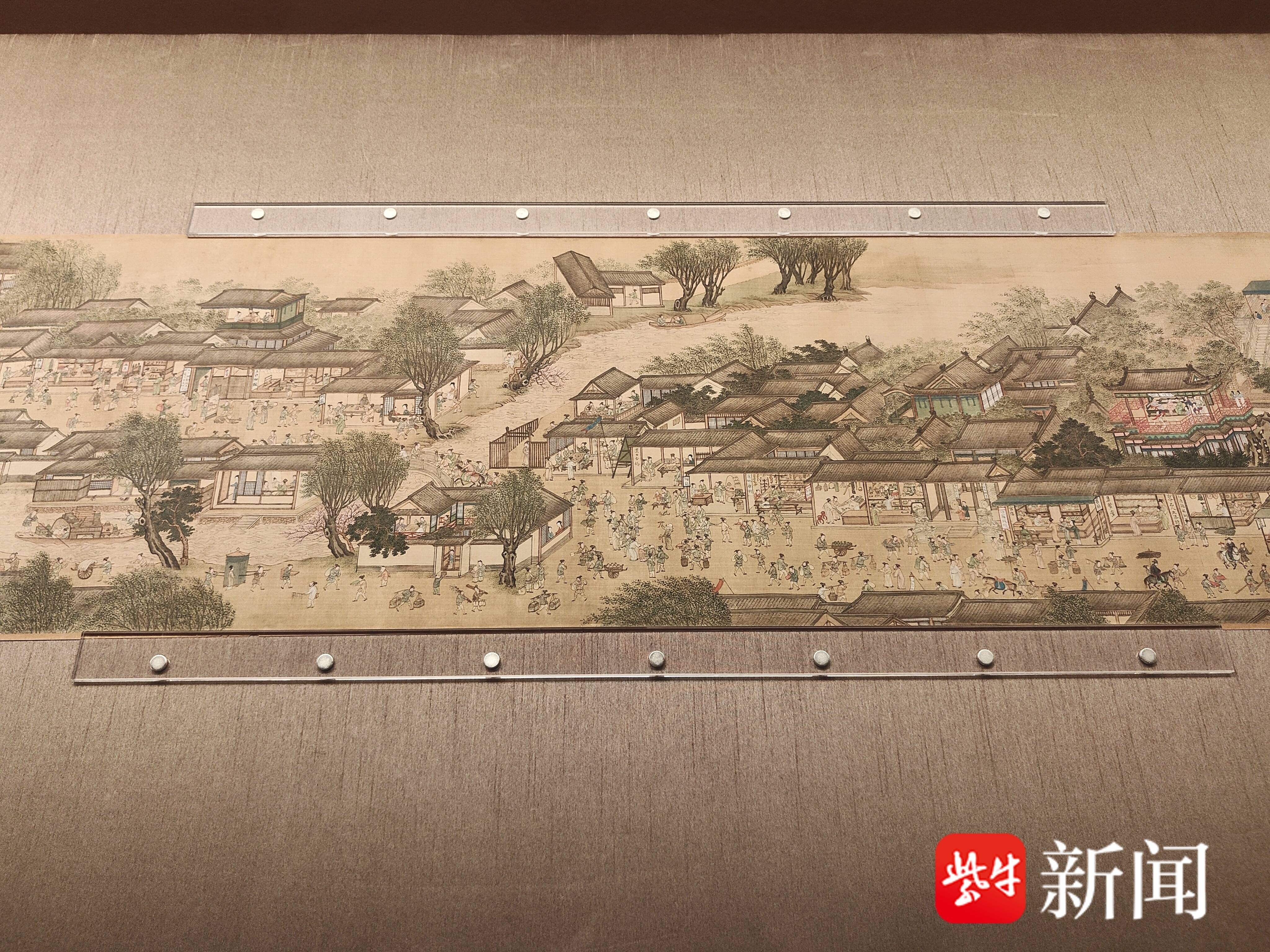 据了解,本次“苏州织造”特展设于苏州博物馆本馆,汇聚10家文博单位、90余件文物。展览以《清明上河图》(仇英本)与《乾隆南巡图》第六卷《驻跸姑苏》两大长卷开篇。其中《清明上河图》(仇英本)近10米长卷以明代苏州城为背景,工笔重彩描绘了2200余名人物。