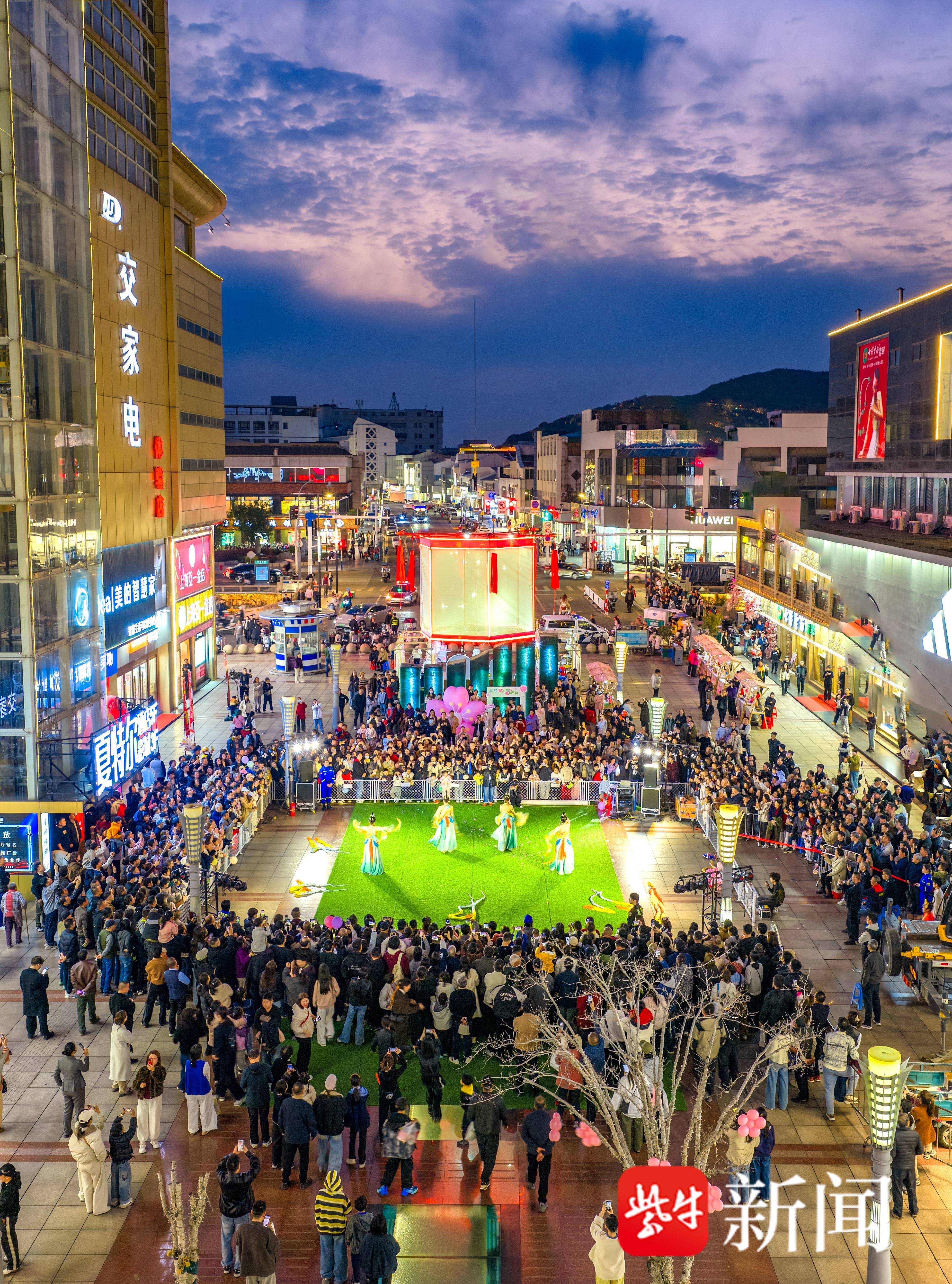 暮色落进方塔东街,宫灯次第亮起,飞天舞者自高处缓缓而下,花瓣随风散开,光影在夜色里轻轻摇曳。人群抬头,脚步慢了下来,手机镜头也纷纷举起。