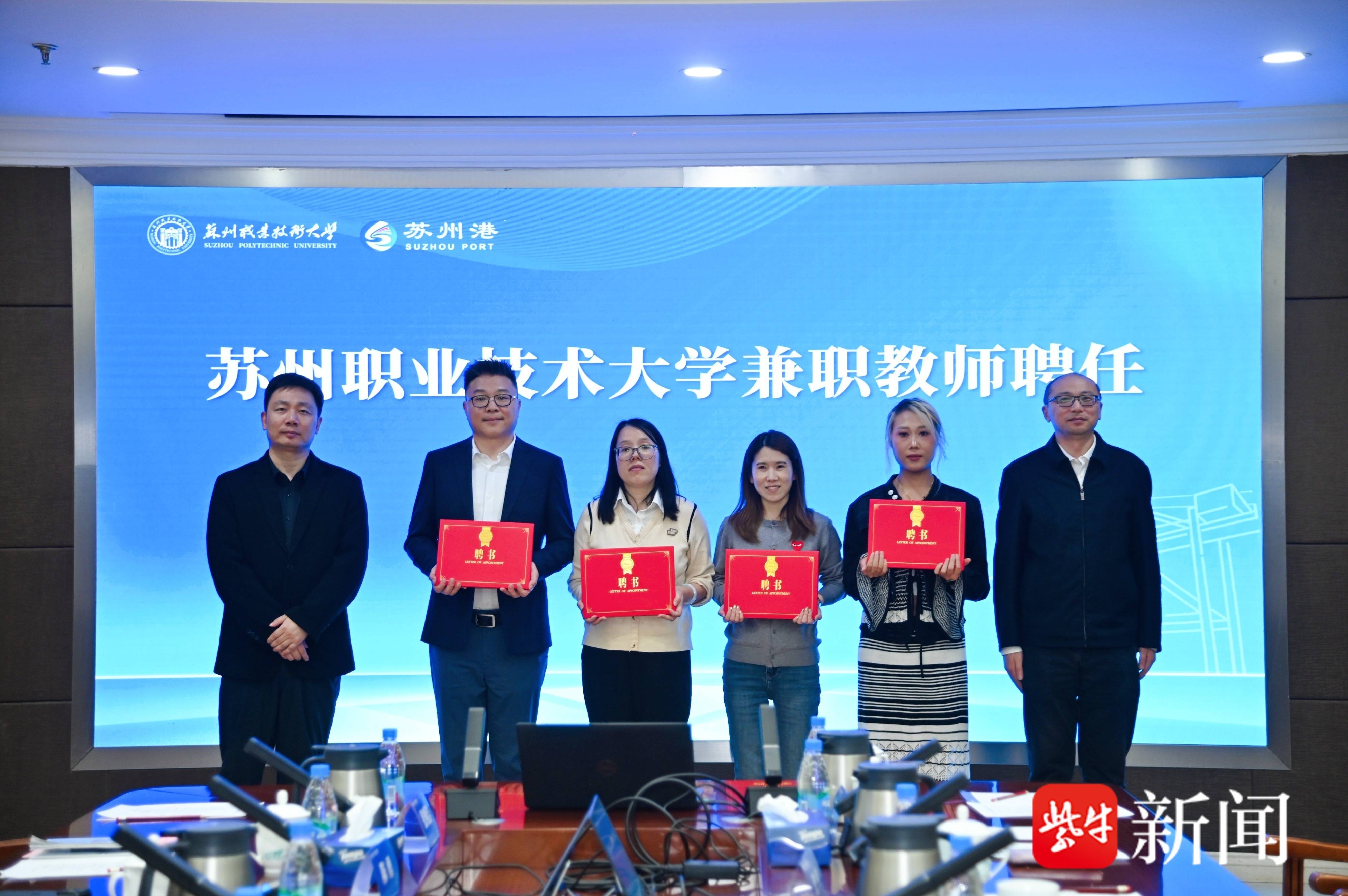 签约仪式后,苏州港管理委员会办公室副主任、太仓港口管理委员会副主任周晓荷与苏州职业技术大学校长陈峻共同为“苏州港AI单据智服中心”揭牌。苏州市教育局职教处处长王云峰与苏州职业技术大学副校长张军为来自江苏恒隆物流有限公司的各位企业专家颁发兼职教师聘书,受聘人员将参与学校专业课程教学与实践指导,推动企业案例进课堂。