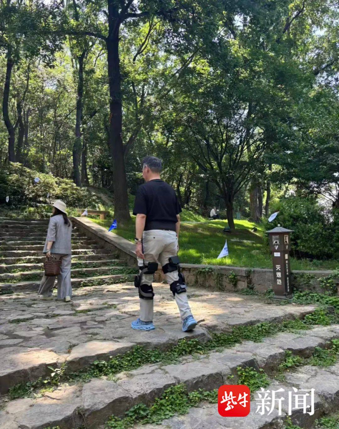记者在现场看到,这款设备用机械设备包裹住膝关节,由一个小巧的电机、一个电池以及三条绑带组成,穿戴也简单轻便。 它的原理是参考岩羊的攀岩能力和发力结构,采用人体工学一体化设计并接入AI优化算法在上坡、登阶等关键动作中,智能识别动作意图并主动提供支撑与托举。体验者张老伯说:“我爬上去用了7分钟,而且只用了平时三分之一的力量。”