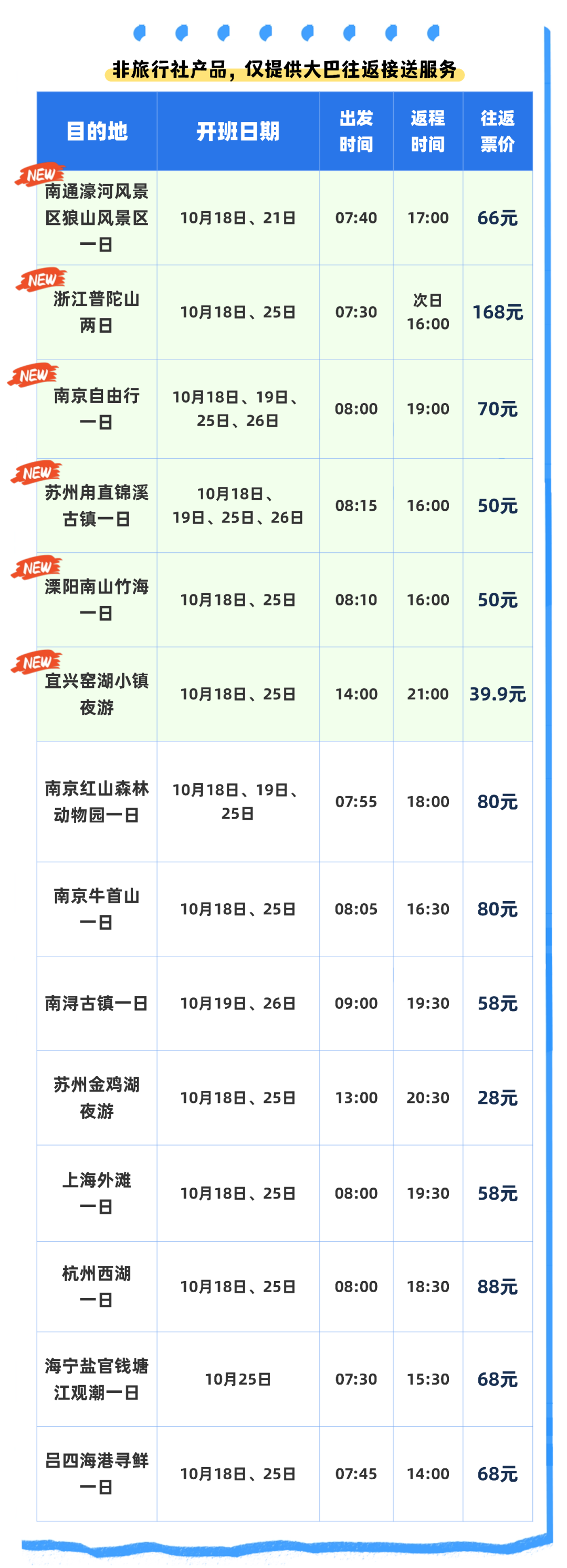 非旅行社产品,仅提供大巴往返接送服务,到达后自行活动,请注意安全。上述票价均仅包含往返车票,6周岁或1.2米以下儿童免票,购票时需提前申请,否则无法乘坐。
