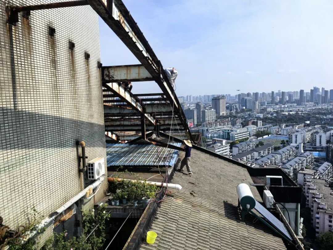 当社区提出整治楼顶钢架的议案后,居民意见不尽相同。有人主张“一拆了之”,彻底消除隐患;有人则难舍二十年的情感记忆,希望保留这一社区标志。面对分歧,新江南花园社区联合清名桥城管中队组建联合工作组开展逐户走访,广泛征集居民意见;组织召开多次民主协商会,邀请市设计院专家参与技术论证,最终确定“保留主体、消除隐患、加固处理”的优化方案,保留钢架主体,仅拆除隐患部分,并对保留部分进行全面加固和防锈处理,实现历史风貌保护与安全隐患消除两全其美。
