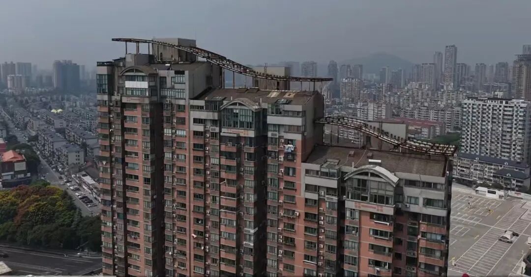 新江南花园社区世代雅居楼顶弧度钢架作为小区标志性构筑物,已建成使用二十年。随着时间推移,该钢架结构长期经受风雨侵蚀,出现严重锈蚀、部分构件松动等安全隐患,曾经的“社区标志”已转变为“群众心病”。