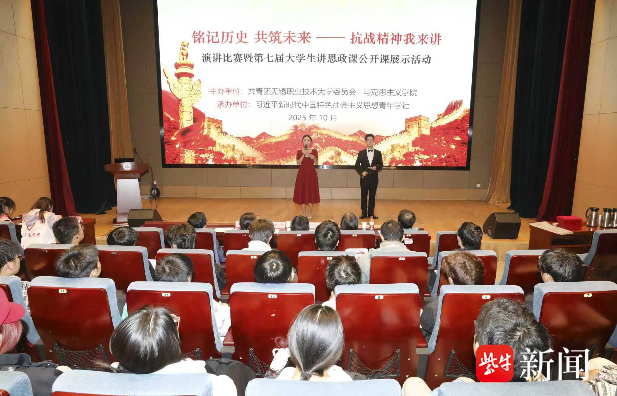 为纪念中国人民抗日战争暨世界反法西斯战争胜利80周年,厚植爱国情怀,展现新时代大学生的青春担当与精神风貌,10月22日晚,一场主题为“铭记历史 共筑未来——抗战精神我来讲”的演讲比赛在无锡职业技术大学举行,11名预赛选拔出的同学与到场130多名师生分享自己对抗战精神的诠释与感悟。