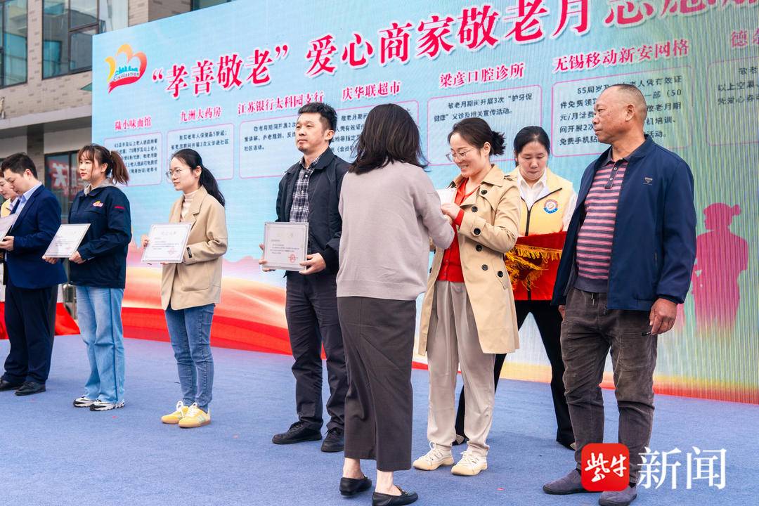 为让老年人更好地乐享晚年,新吴区和各街道精准统筹各方资源,挖掘并发动了一批爱心商家共筑爱老敬老服务网格,推出涵盖惠老助餐、金融防诈、健康惠民、生活保障等在内的9大志愿服务项目,让尊老敬老从理念倡议走向人人可参与、可感知的日常行动。活动现场向“孝善敬老”爱心商家代表颁发纪念证书,同步为辖区9位“孝老爱亲”类身边好人代表达了敬意与关怀。
