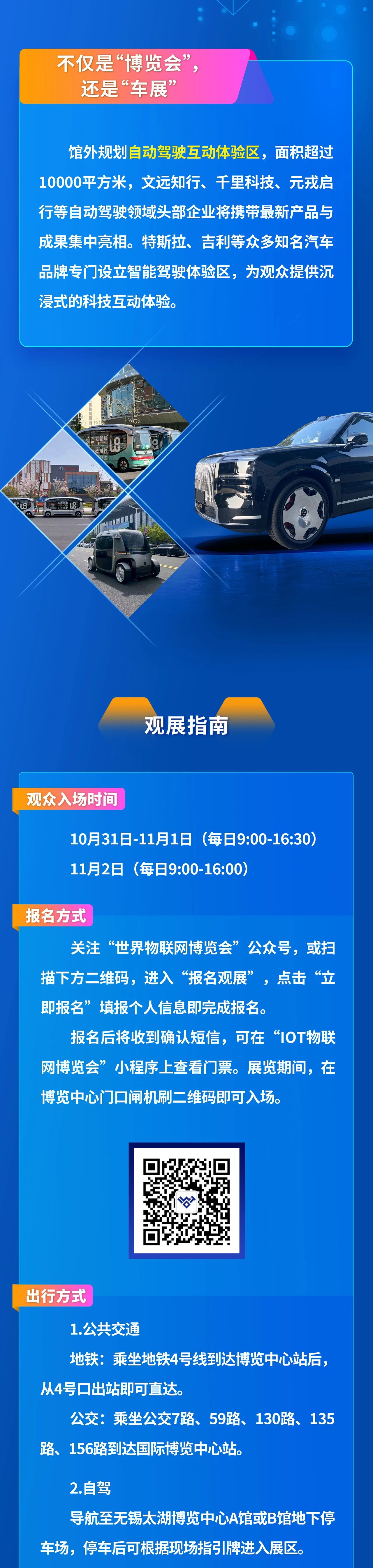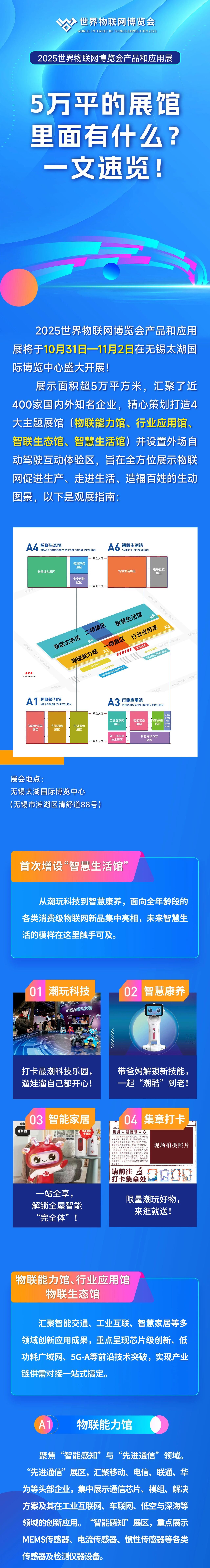 2025世界物联网博览会(下称:物博会)即将在无锡开幕,产品和应用展也将在无锡太湖国际博览中心开幕,作为普通市民也可以参与,具体可以关注“世界物联网博览会”公众号,点击报名观展即可,参观时间为10月31日至11月2日,每天9:00-16:30。同时,想要参与相关系列活动,也可以关注“无锡发布”微信公众号,在公众号对话框回复关键词“物博会”,获取预约方式。