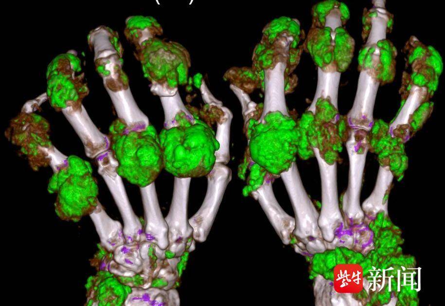 在家人的催促和陪伴下,刘大爷来到了南京市第一医院风湿免疫科主任、博士生导师车楠的专家门诊。通过检查发现,刘大爷尿酸值604umol/L,除了满身痛风石,他还查出了高血压、慢性肾功能不全、高脂血症,双肾里还藏着好几颗小结石,血沉和C反应蛋白也偏高,这说明他身体里的炎症就没停过。