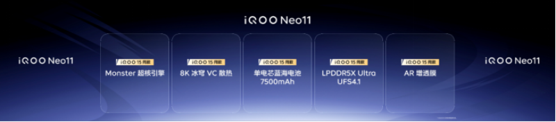 iQOO Neo11 搭载由骁龙 8 至尊版与自研电竞芯片 Q2 组成的“旗舰电竞双芯”,并在 Monster 超核引擎支撑下,带来优秀的 1% Low 帧表现、全新升级的 PC 级 2K 纹理超分、原生级 144FPS 无损超帧以及超分超帧并发,实现行业领先的游戏视效;更以 8K 冰穹 VC 液冷散热、7500mAh 超薄蓝海电池、AR 增透膜等多项 iQOO 15 同款配置、高质感金属玻璃机身和 IP68 & IP69 防尘防水等,共筑一款更优秀的强悍标准版。