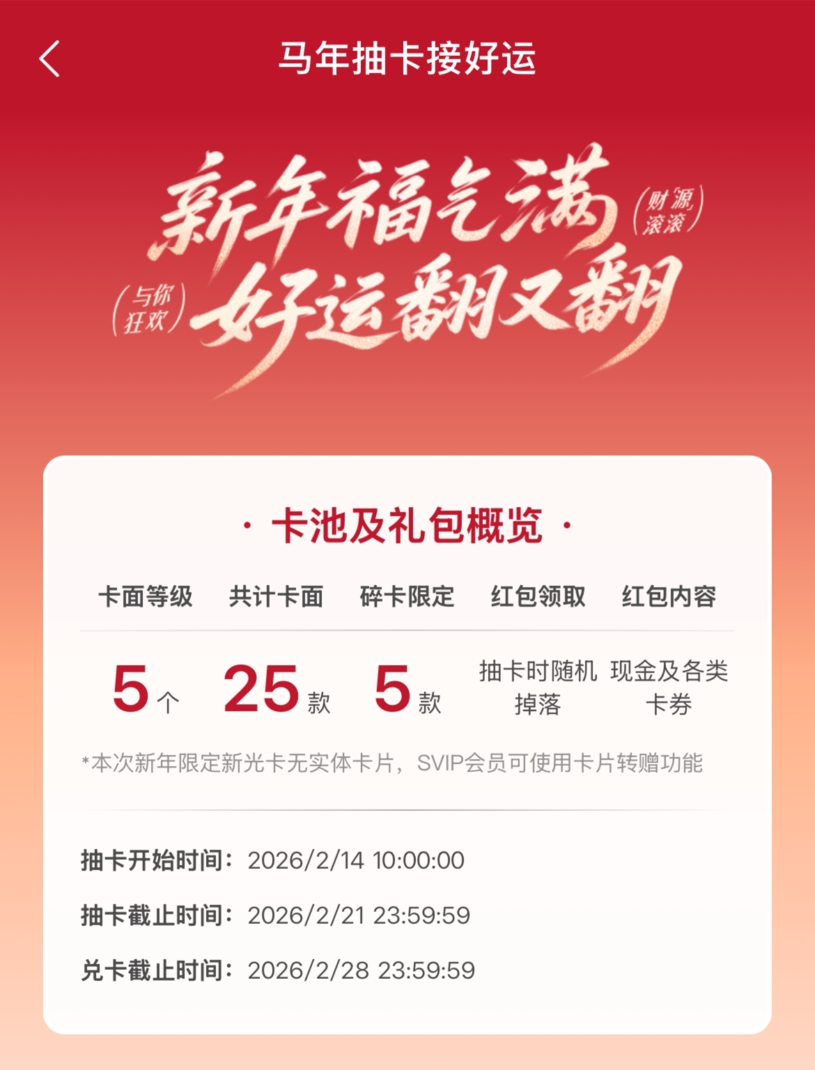 2月14日10点至大年初五,抽卡活动将正式上线。届时,25款精心设计的新年卡片将全面开放抽取,参与抽卡即有机会领取海量现金红包。集卡玩法与现金激励的结合,既满足了年轻用户的收藏乐趣,又提供了实实在在的新春福利。