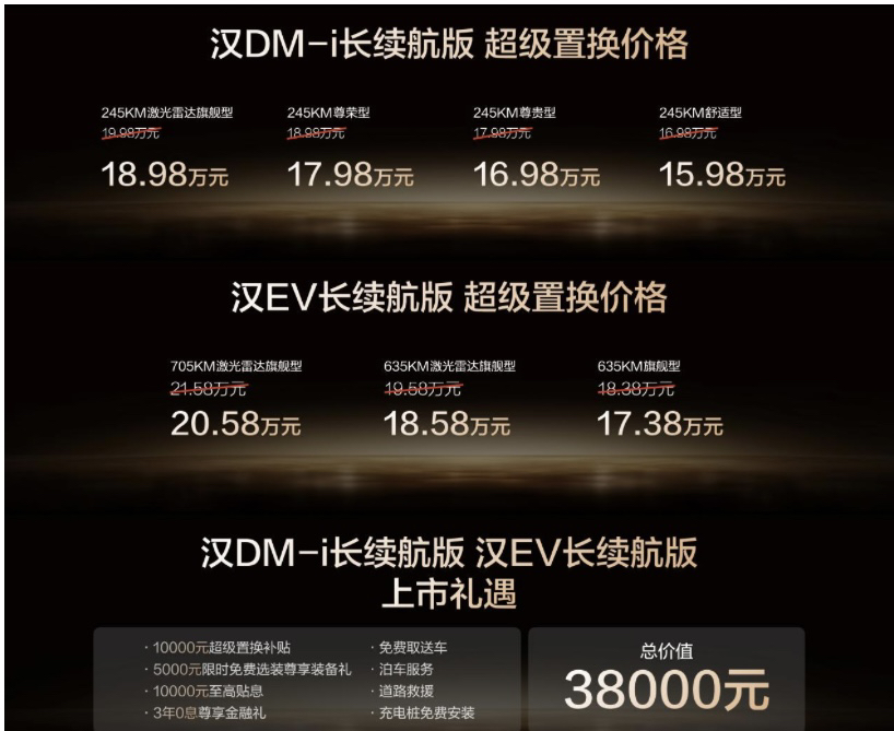10月11日,比亚迪汉家族迎来重磅升级——汉长续航版正式上市。汉DM-i长续航版共推出4款车型,补贴后售价15.98万—18.98万元;汉EV长续航版共推出3款车型,补贴后售价17.38万—20.58万元(10月31日前完成购车可享1万元超级置换补贴)。同时,用户还可享至高3.8万元七大礼遇,包括置换补贴、金融贴息等,进一步降低购车门槛。