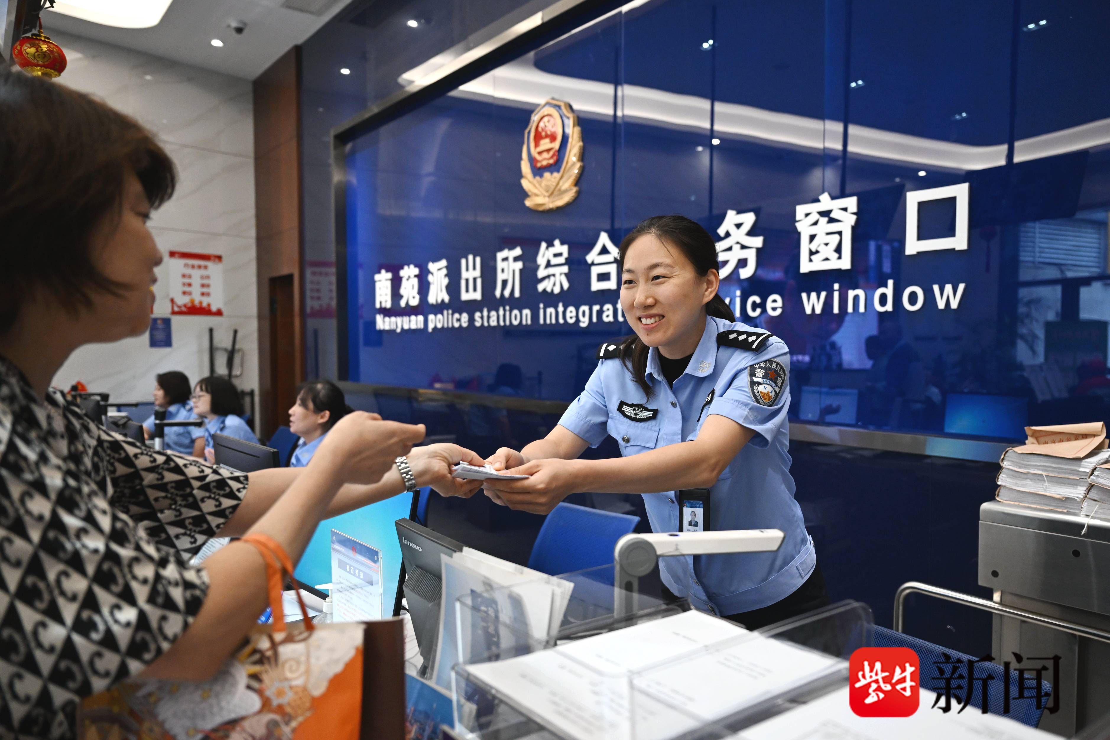 随着2005年首批换发的二代居民身份证20年有效期陆续届满,2025年国庆长假前夕,南京市公安局建邺分局各身份证办理窗口迎来集中换证高峰期。为全力保障群众用证需求,建邺分局多措并举,全力提供“就近办、网上办、错峰办、加急办”等便民服务,不断调度整合资源,增开业务窗口,加强讲解疏导,提升办理效率,减少等待时间,满足群众多样化需求。图为民警、辅警为群众办理身份证和讲解办理材料。