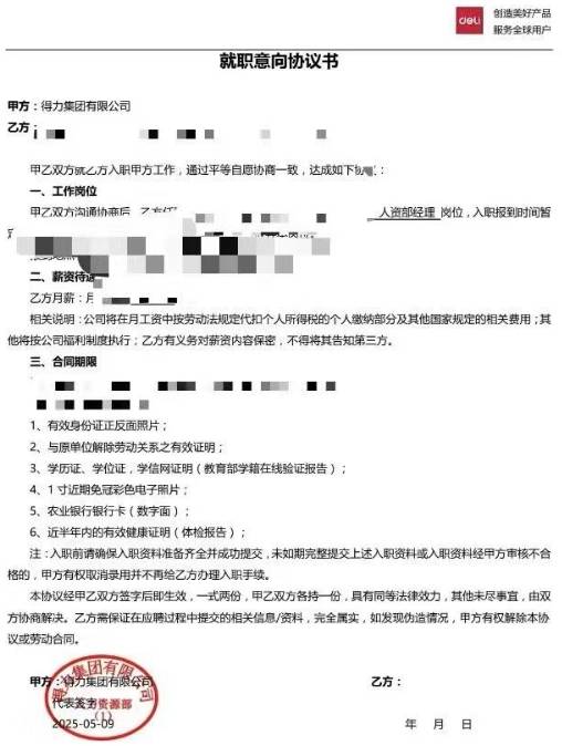 据该网友文中介绍,今年5月初,她先后通过得力集团两轮线上面试和一轮现场面试,成功收到HRBP(人力资源部经理)岗位的入职通知,后续被告知需前往浙江宁波的集团总部完成报到与培训。
