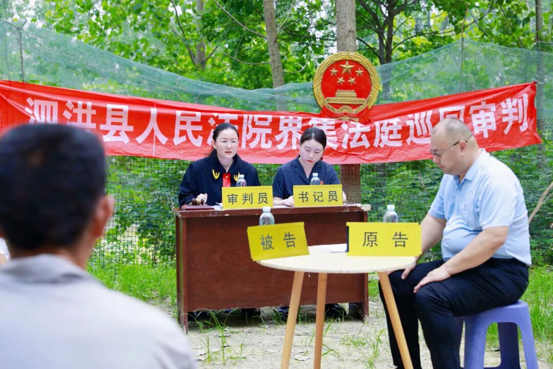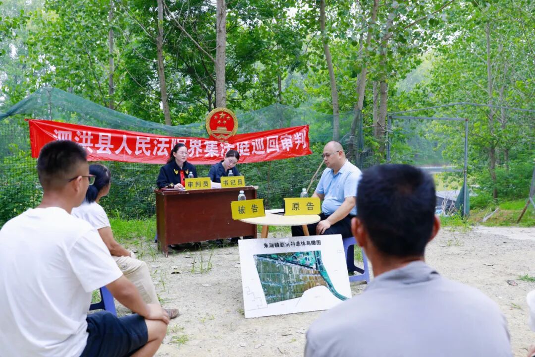 7月23日,在泗洪县新洪村河堤旁的树荫下,泗洪县人民法院界集人民法庭法官巡回开庭审理一起土地承包经营权纠纷案件。