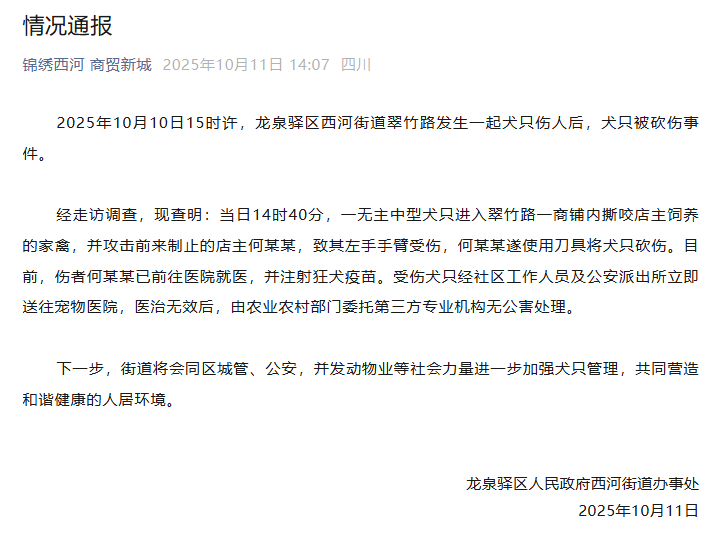 10月11日,扬子晚报/紫牛新闻记者注意到,成都市龙泉驿区人民政府西河街道办事处发布情况通报:2025年10月10日15时许,龙泉驿区西河街道翠竹路发生一起犬只伤人后,犬只被砍伤事件。