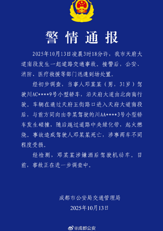 记者注意到,今天(13日)下午,成都市公安局交通管理局针对这一事故发布了警情通报。通报称:2025年10月13日凌晨3时18分许,我市天府大道南段发生一起道路交通事故。接警后,公安、消防、医疗救援等部门迅速到场处置。