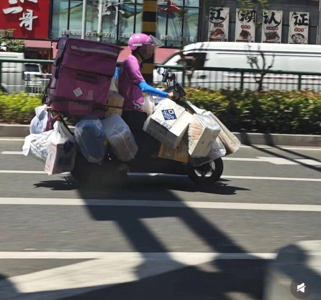 骑手送山姆货物挂满电动车引担忧,配送站点:三轮车严管,骑手为挣钱拿货多