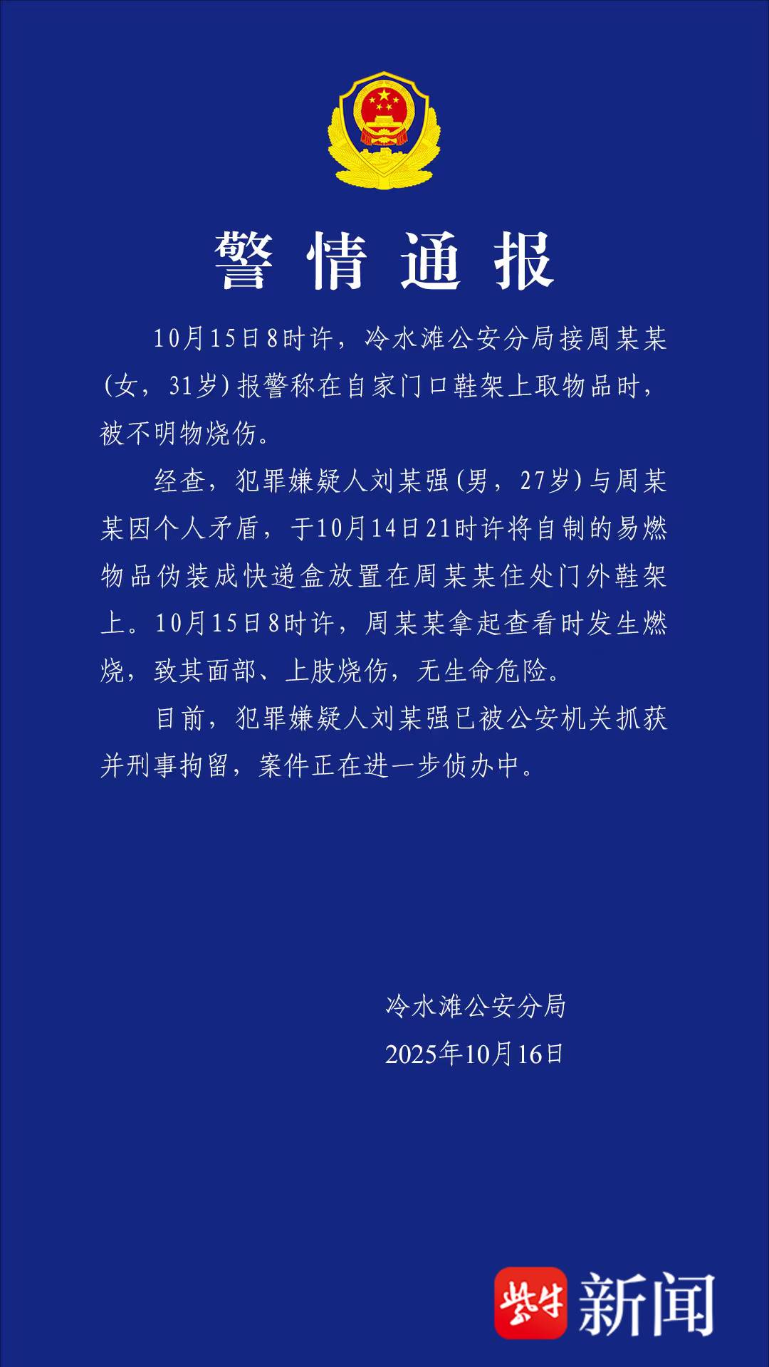 10月15日,有网友在短视频平台发布视频称,她被家门口放在鞋架上的快递包裹烧伤,造成面部和手臂受伤,伤情较为严重。16日下午,湖南省永州市公安局工作人员回应扬子晚报/紫牛新闻记者称,此事相关部门正在核查处置当中,宣传部门会有统一答复。16日晚,记者注意到,冷水滩分局发布情况通报称,该案系个人矛盾,嫌疑人已被刑拘。