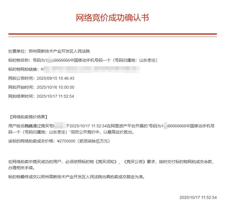 阿里资产平台显示,该拍卖有4人报名,吸引超4万次围观,共有67条竞买记录,最后一次出价时间为10月17日11时47分。“网络竞价成功确认书”显示,一位魏姓用户通过竞买号M2561以最高应价胜出,成交价格为275万元。