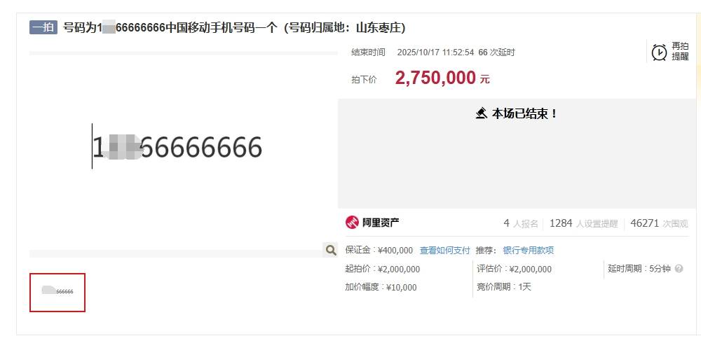 尾号66666666手机号275万元拍出,共4人报名竞拍,吸引超4万次围观