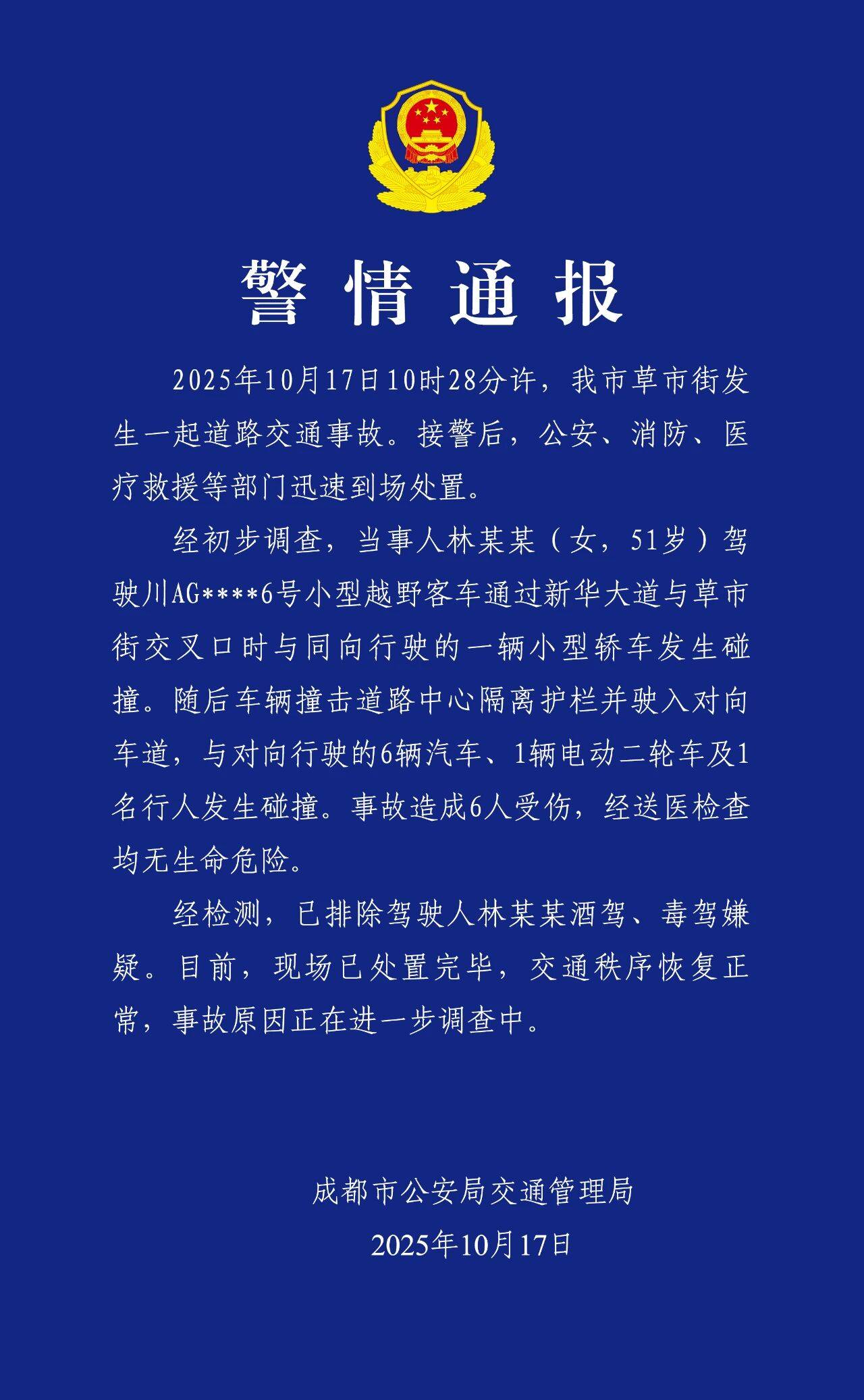 成都发生一起车祸致6人受伤 驾驶员排除酒驾、毒驾嫌疑