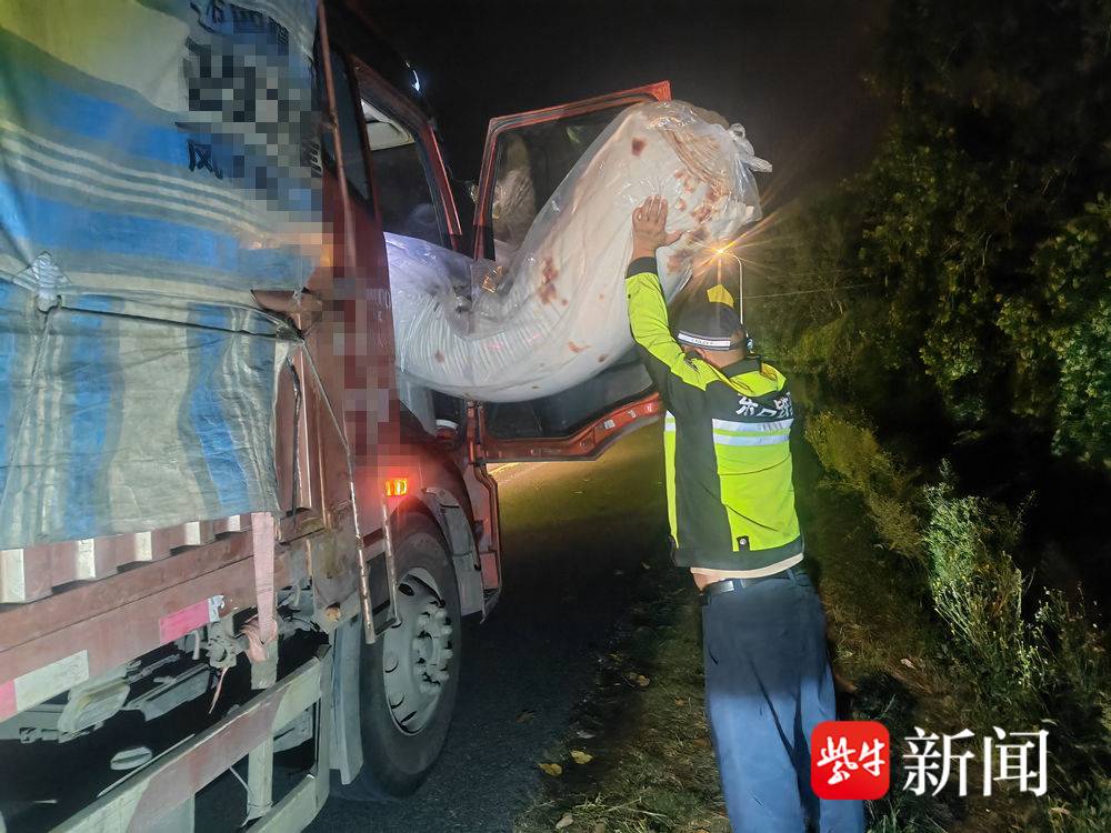 10月18日晚20时许,民警在204国道开展夜间巡逻至711公里路段时,发现一辆重型仓栅式货车违规停放在非机动车道上。民警见状立即下车,走向货车驾驶员,准备劝其驶离。走近后才发现,情况远非违停这么简单。驾驶员正手忙脚乱地将掉落的货物往驾驶室后方的卧铺上塞,车头旁还堆放着一大卷货物,这些货物疑似因未捆绑牢固而意外掉落。