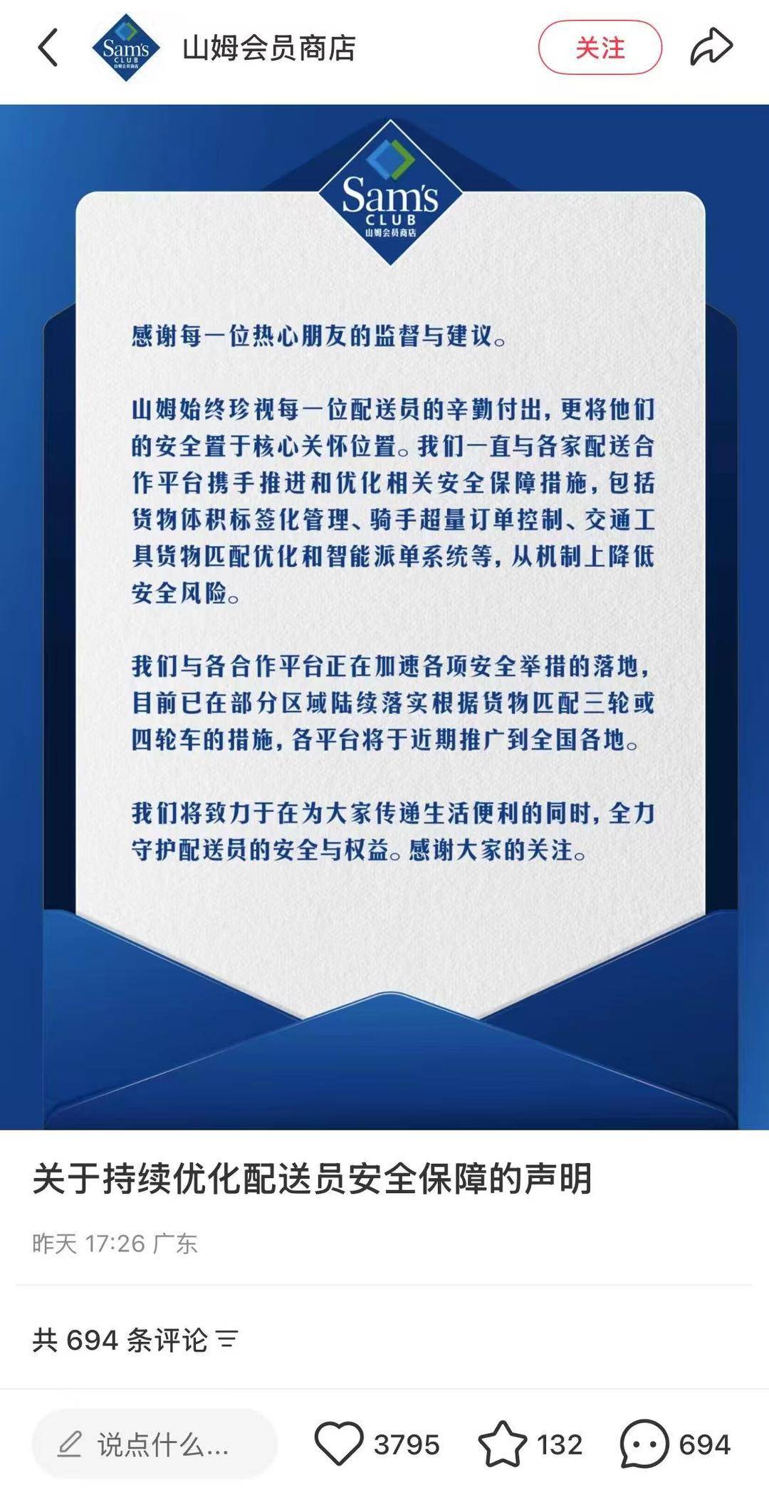 声明中称,山姆始终珍视每一位配送员的辛勤付出,更将他们的安全置于核心关怀位置。“我们一直与各家配送合作平台携手推进和优化相关安全保障措施,包括货物体积标签化管理、骑手超量订单控制、交通工具货物匹配优化和智能派单系统等,从机制上降低安全风险。我们与各合作平台正在加速各项安全举措的落地,目前已在部分区域陆续落实根据货物匹配三轮或四轮车的措施,各平台将于近期推广到全国各地。”