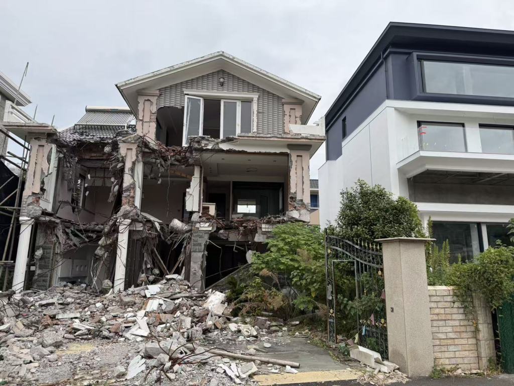 “到了2023年至2024年间,1号、2号、13号等房屋外墙被敲出多个大洞,制造‘危房’假象,再以此为理由申请重建,目前1号、2号楼已经完工,加高到四层,13号楼在拆除重建过程中被突然叫停,目前已烂尾。”余先生称,部分改扩建的房屋,面积都达到了六七百平方米。