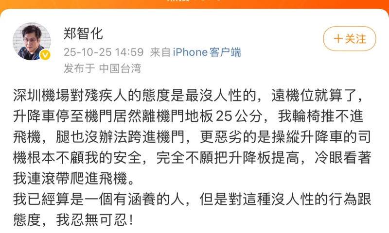 10月25日,歌手郑智化在微博发文表示,自己在深圳机场乘坐航班的时候,升降车升至机门后离机门地板有25厘米距离,导致其轮椅无法推入飞机。而操纵升降车的司机不愿把升降板提高,冷眼看着他“连滚带爬”进飞机。此事在网络上引起关注和热议。
